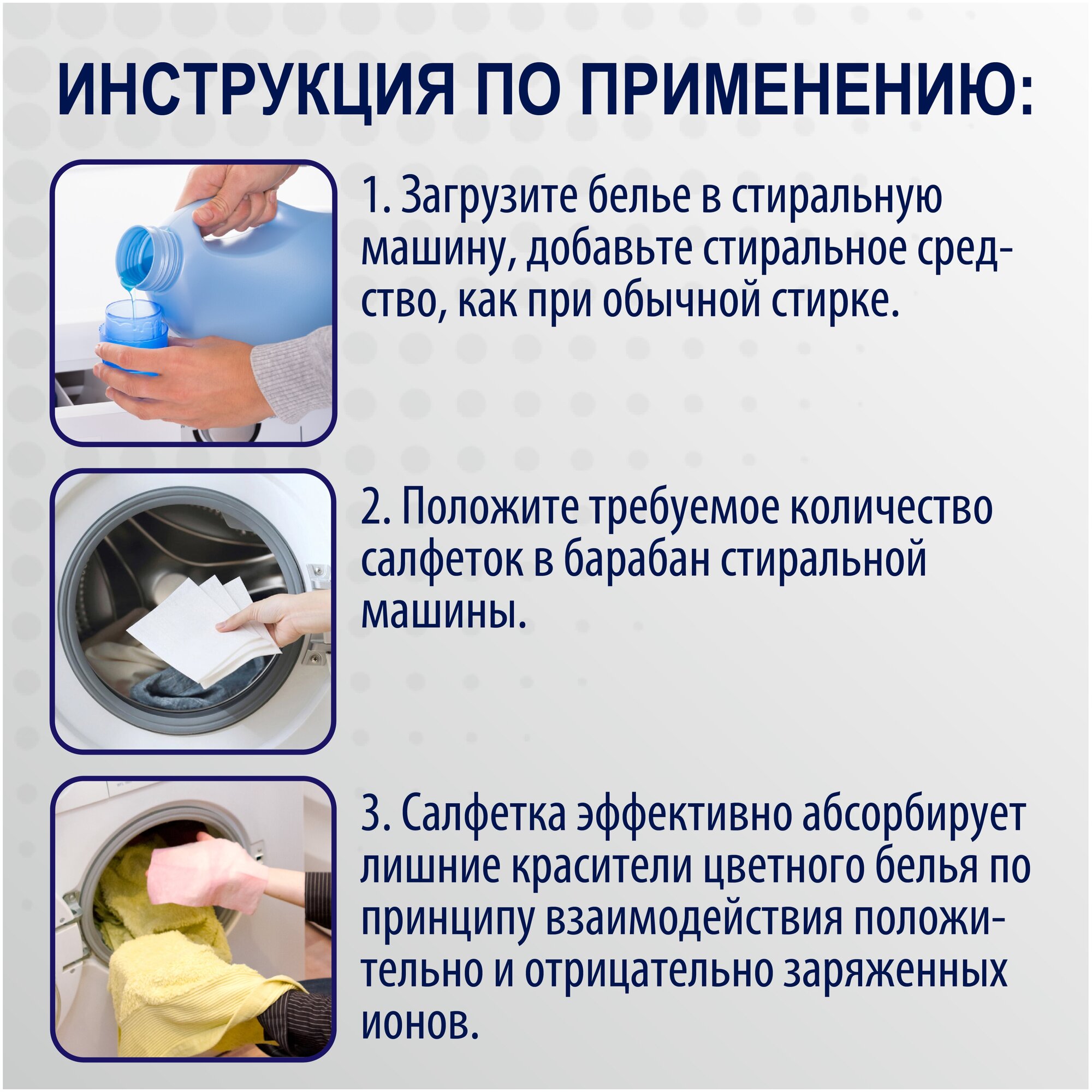 Благодаря своей уникальной сотовой структуре салфетка поглощает выделяемый в воду красящий компонент и прочно удерживает его внутри себя, препятствует перемещению ненужных цветов и оттенков во время стирки, не допускает попадания на другие вещи.