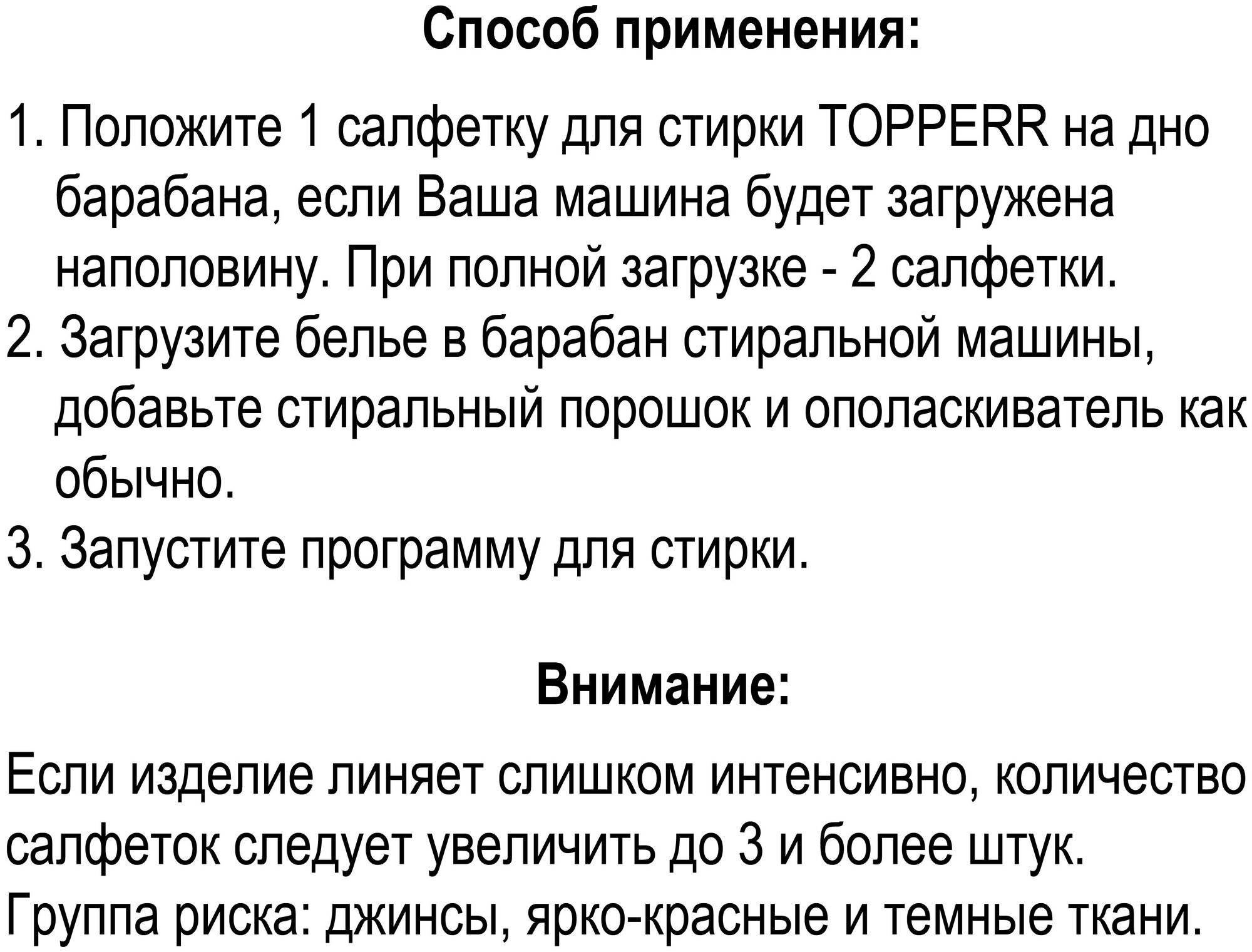 1. Положите 1 салфетку для стирки TOPPERR на дно барабана, если Ваша машина будет загружена наполовину. При полной загрузке - 2 салфетки.