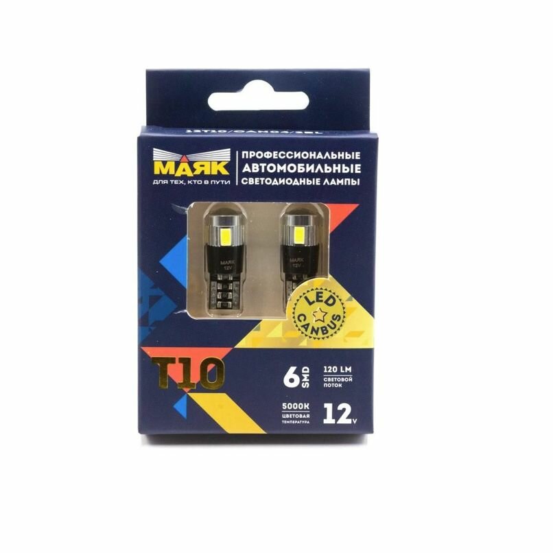 Лампа автомобильная светодиодная МАЯК T10 12В 10Вт 3200К 2шт 12T10/CAN04/2BL