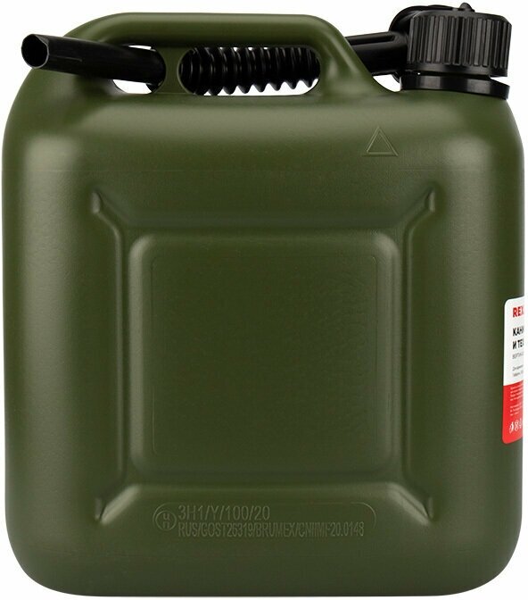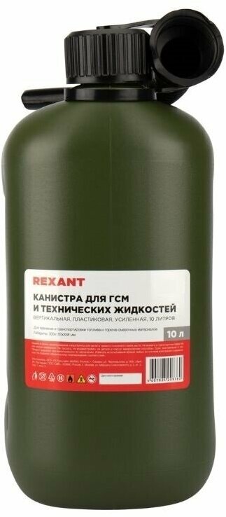 Вертикальная усиленная канистра Rexant предназначена для хранения и транспортировки топлива и горюче-смазочных материалов. Изготовлена из высококачественного прочного (первичного в производстве) полиэтилена (ПЭНД). Имеет международный сертификат соответствия перевозки легковоспламеняющихся грузов, наличие которого дает возможность заправлять канистру на любых АЗС, находящихся на территории РФ и ЕС.