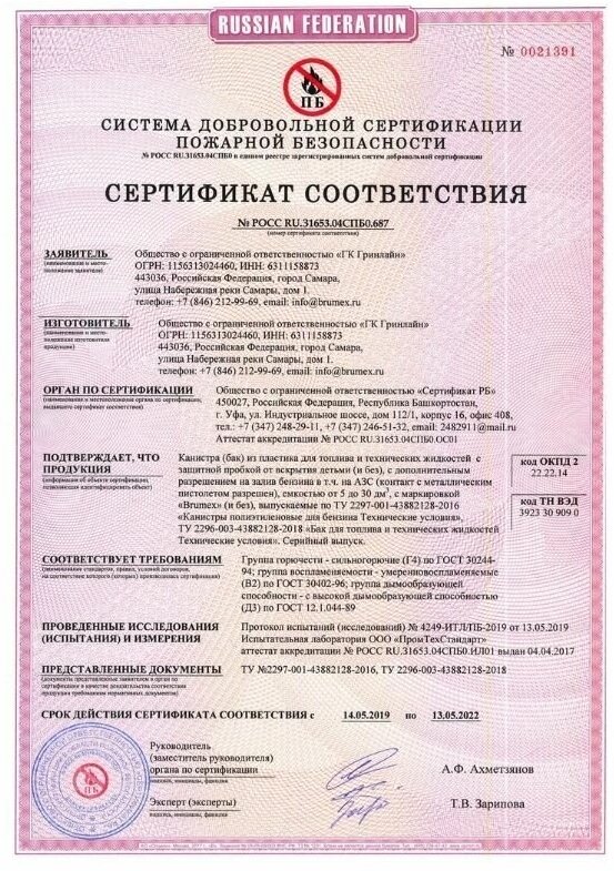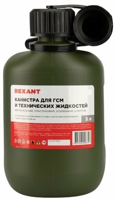 Вертикальная усиленная канистра Rexant предназначена для хранения и транспортировки топлива и горюче-смазочных материалов. Изготовлена из высококачественного прочного (первичного в производстве) полиэтилена (ПЭНД). Имеет международный сертификат соответствия перевозки легковоспламеняющихся грузов, наличие которого дает возможность заправлять канистру на любых АЗС, находящихся на территории РФ и ЕС.