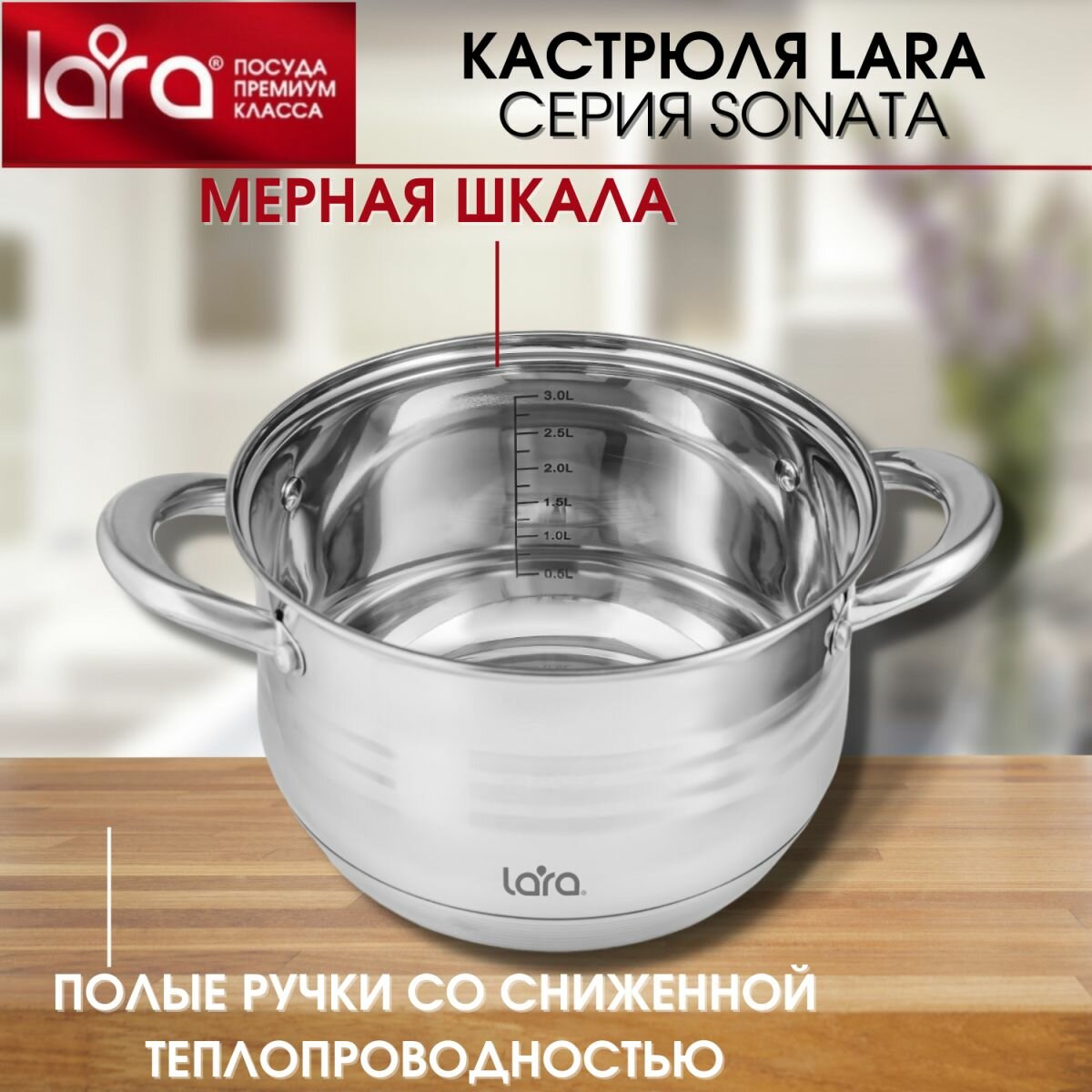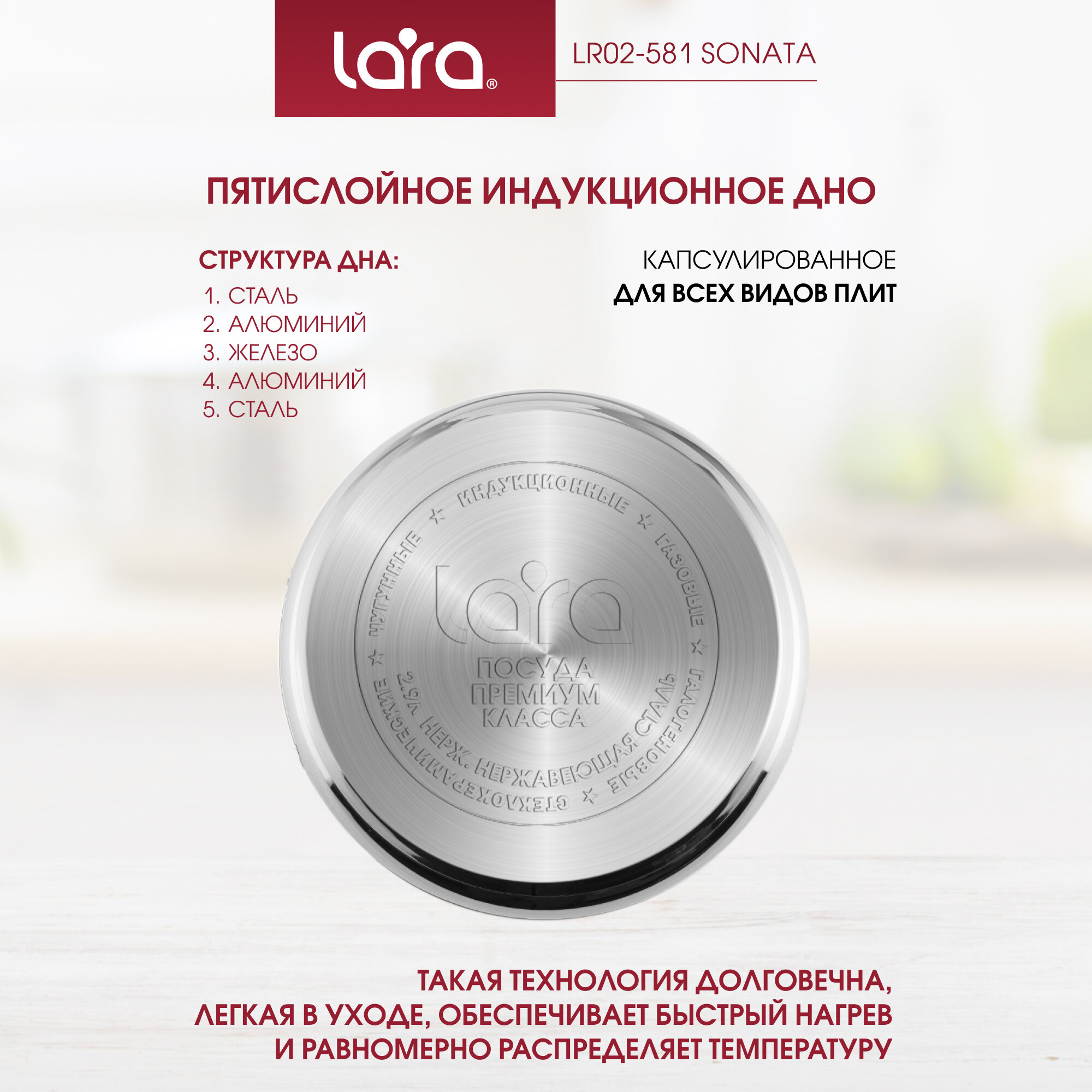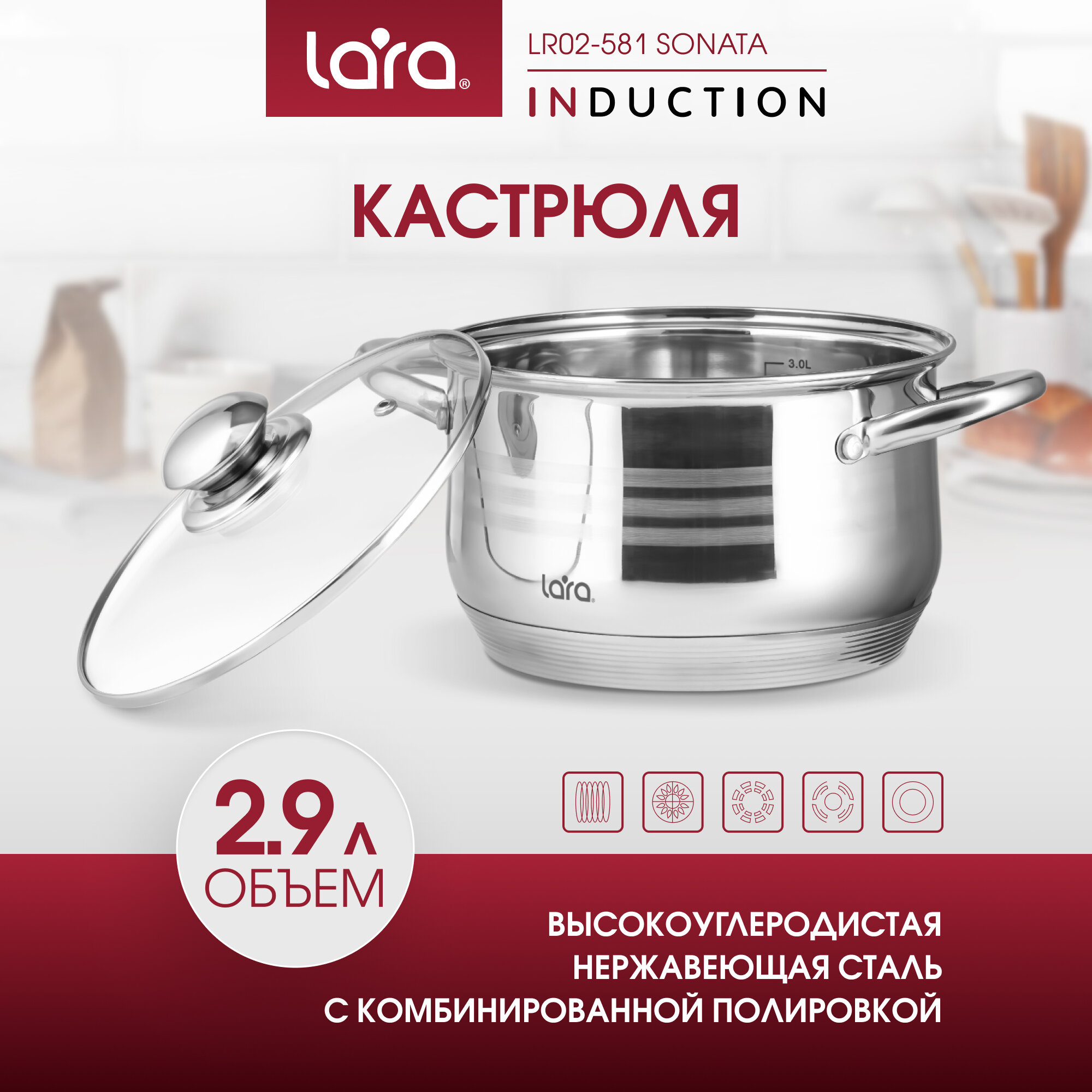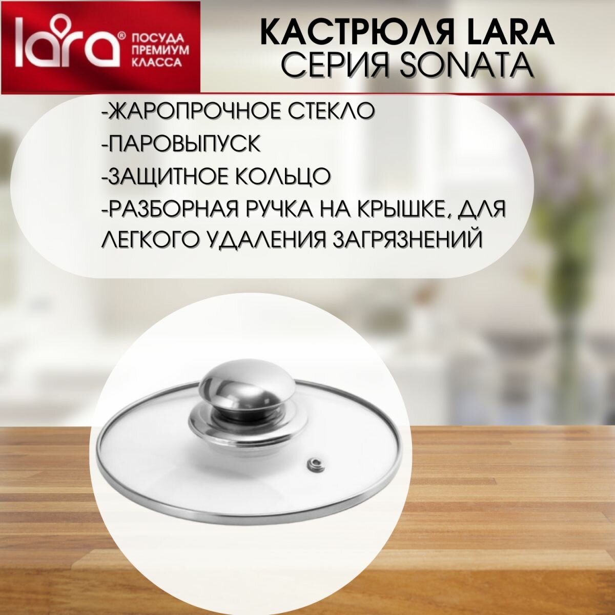 Кастрюля Lara серии «Sonata» за счет своей уникальной конструкции позволяет готовить как на плите, так и в духовке. Подходит для всех типов плит.Преимущества:- Девятиступенчатое дно;- Мерная шкала;- Пятислойное капсулированное дно;- Полная индукция;- Надежные массивные рукоятки со сниженной теплопроводимостью;- Разборная ручка крышки для легкого удаления жира.