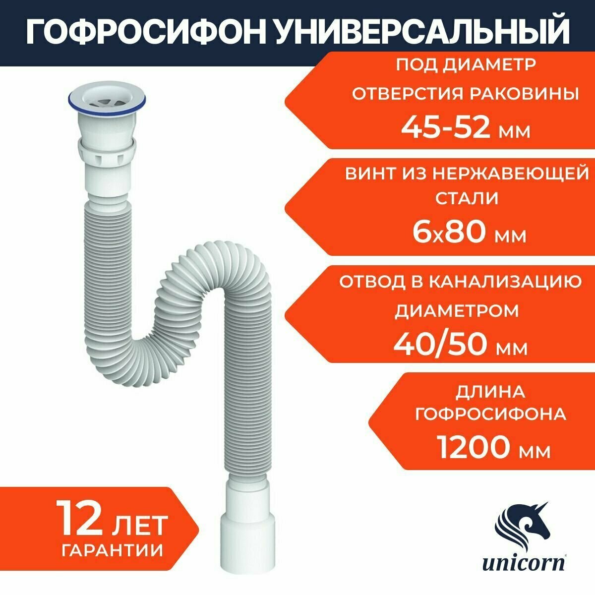 Универсальный гофросифон Unicorn применяется для соединения раковины с канализационной системой. В сифоне используется уплотнительная прокладка из термоэластопласта - высокопрочного, высокоэластичного экологически чистого материала, устойчивого к перепадам температур и химическим воздействиям.