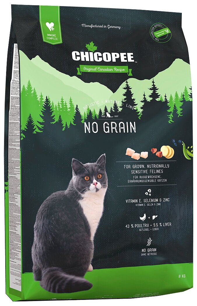 Chicopee HNL Cat No Grain сухой беззерновой корм для кошек с чувствительным пищеварением. Беззерновой рацион Chicopee No Grain содержит высокий процент мяса птицы (свежего и дегидратированного) и совсем не содержит злаков. В качестве легкоусвояемого источника углеводов используется свежий картофель и горох. Это позволяет кормить животное полноценно, избегая присутствие злаковых в его рационах. Особенно рекомендована данная формула для кошек с чувствительным пищеварением, в том числе с выраженной непереносимостью злаков. Добавление 9,5% печени (свежей и сушеной) улучшает необыкновенные вкусовые качества рациона. Витамин Е, селен и цинк обеспечивают естественную защиту организму животного. Все три компонента являются сильными антиоксидантами и снижают уровень свободных радикалов в теле кошки.