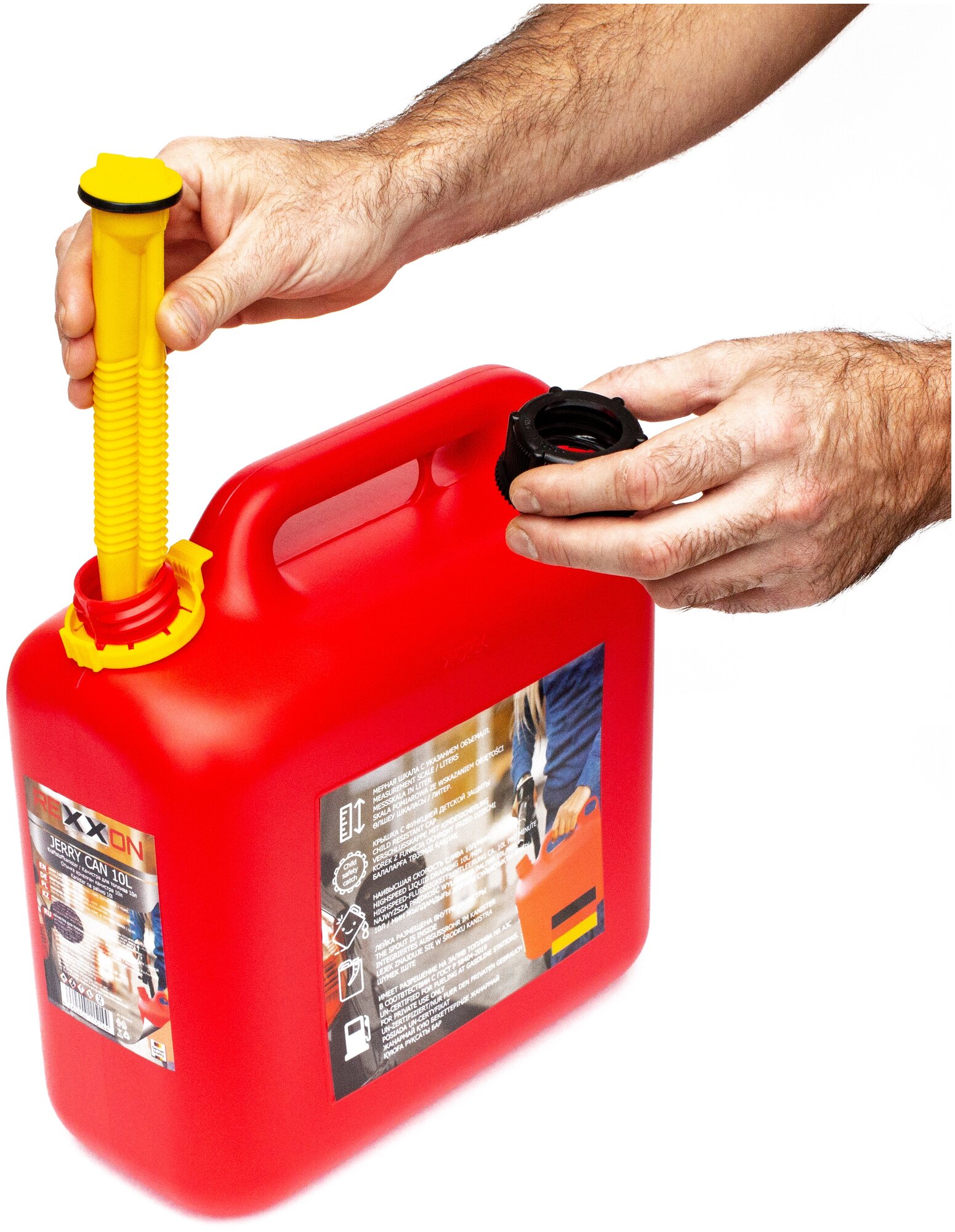 | Применение продукта | Канистра для топлива New Generation предназначена для безопасного хранения и транспортировки горюче-смазочных материалов (бензин, дизельное топливо, смазочные материалы, специальные жидкости). В комплекте: канистра, крышка, заливной носик. Мерная шкала с указанием объема/л. Крышка с функцией детской защиты Наивысшая скорость слива топлива 10 л/мин. Заливной носик размещен внутри самой канистры. Имеет разрешение на залив топлива на АЗС в соответствии с ГОСТ Р 58404-2019 |
