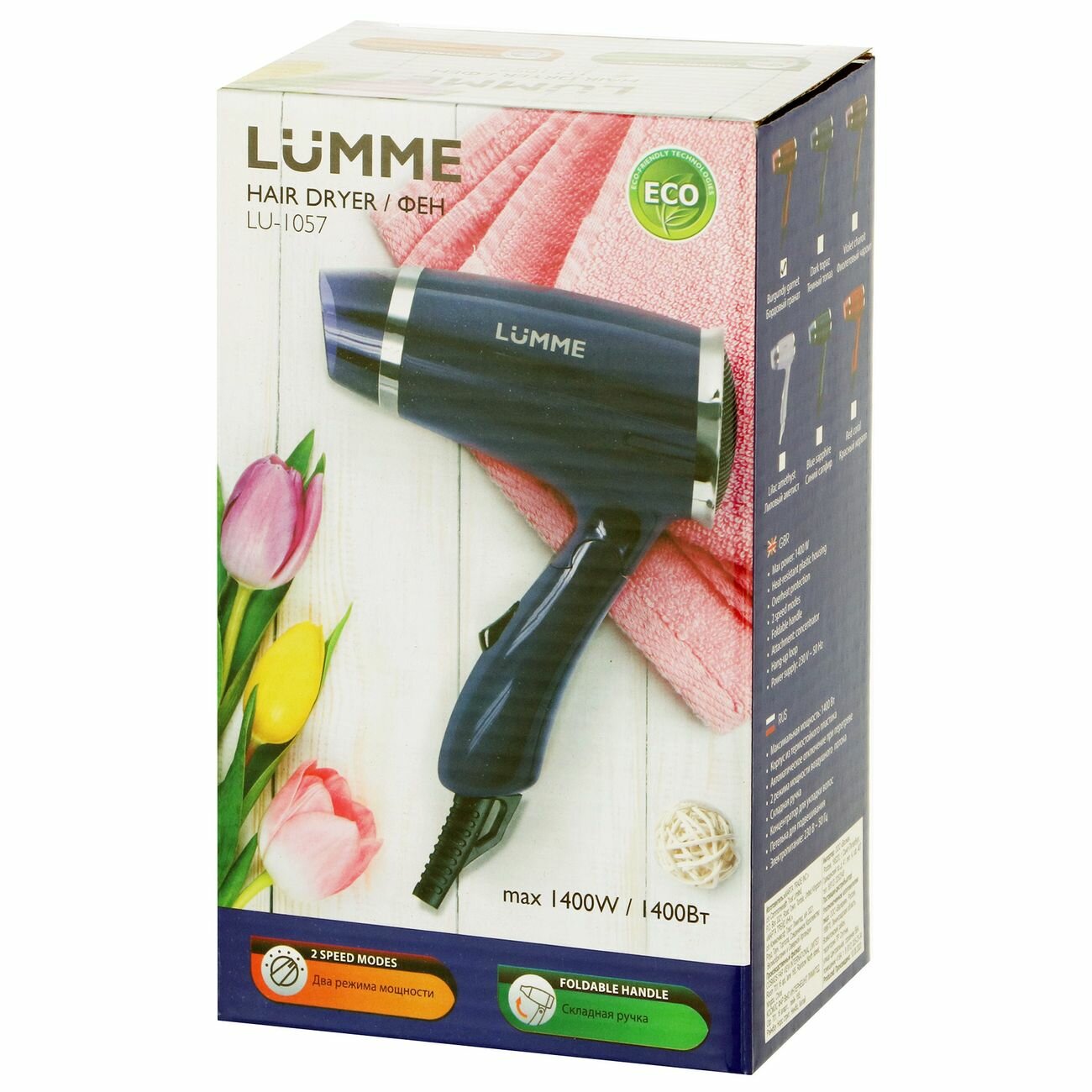 Фен Lumme LU-1057 станет вашим верным спутником в любой поездке. Компактный и лёгкий прибор со складной ручкой поместится даже в небольшую дорожную сумку, да и при хранении не займёт много места.эффективность И простотаЭта модель оснащена мощным 1400-ваттным мотором и позволяет быстро сушить даже длинные волосы. За управление отвечает одна кнопка: с её помощью вы сможете выбрать один из двух режимов. С насадкой-концентратором воздушный поток направляется более точно, что поможет работать с отдельными прядями. надёжность И практичностьКорпус сделан из прочного термостойкого пластика. В случае перегрева вступит в действие система защитного автоматического отключения – устройство не сгорит. Петелька даст возможность повесить фен на крючок в удобном месте, чтобы он всегда был под рукой.