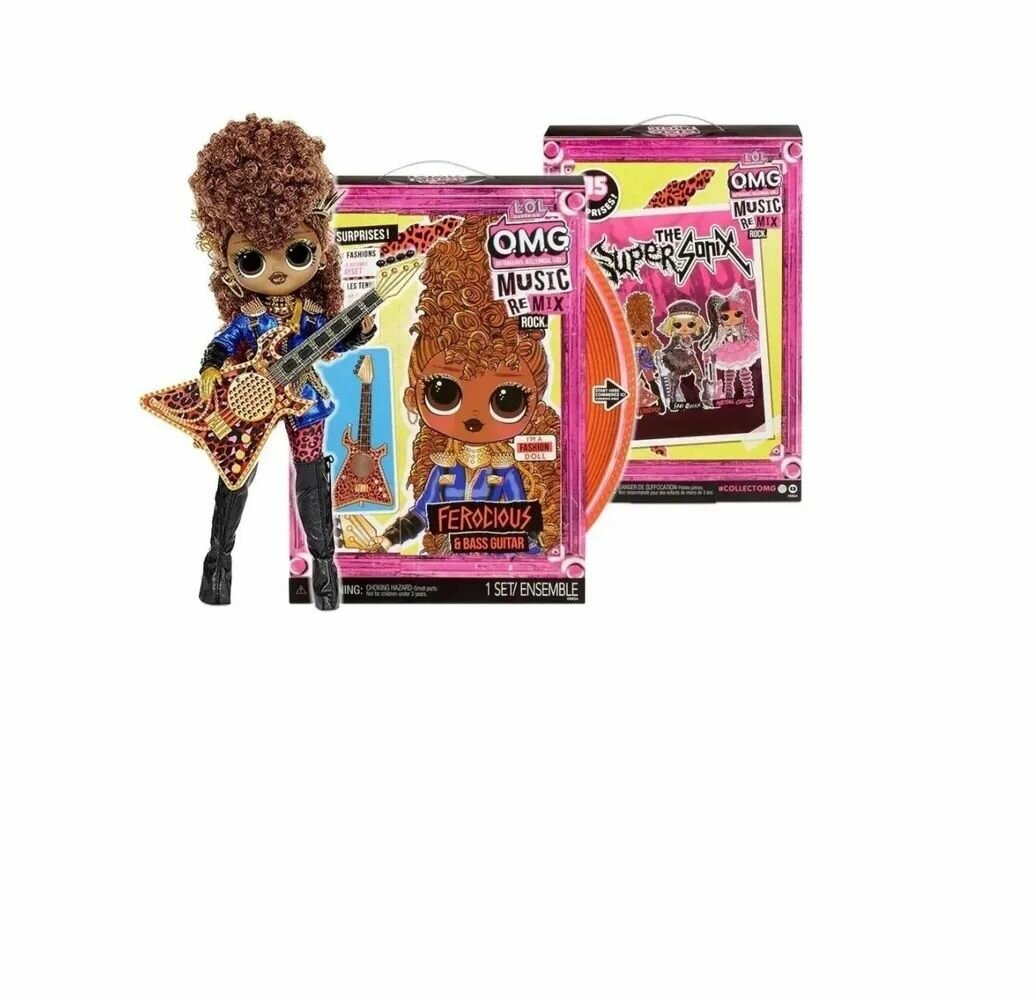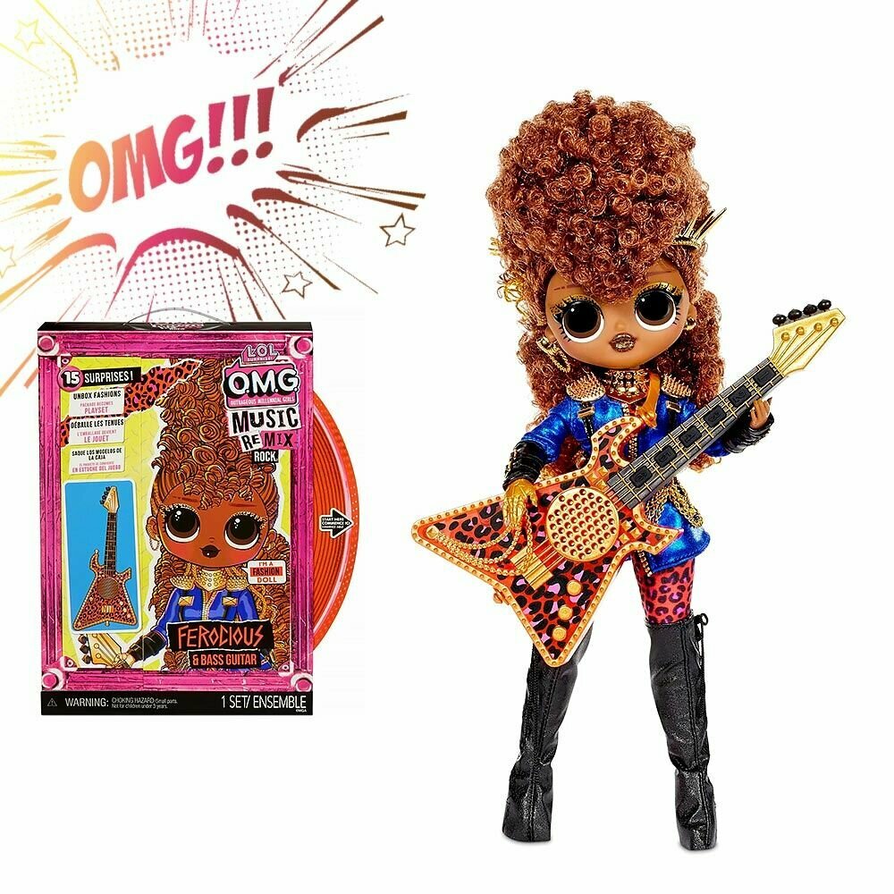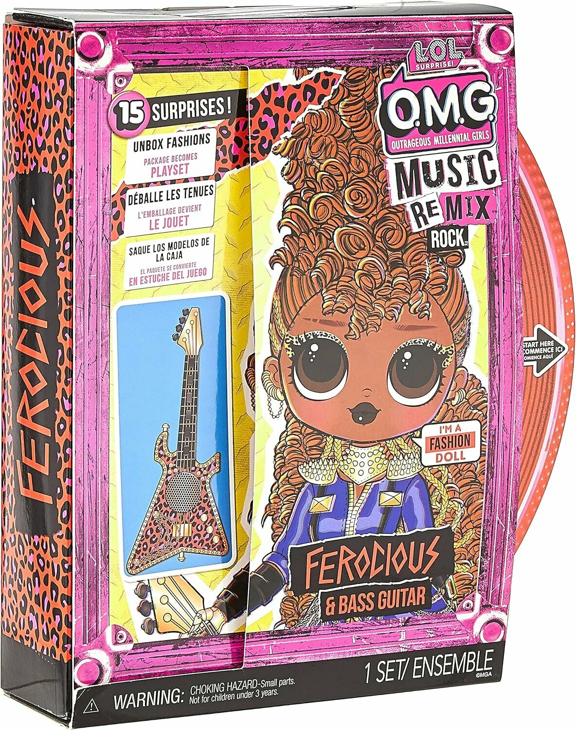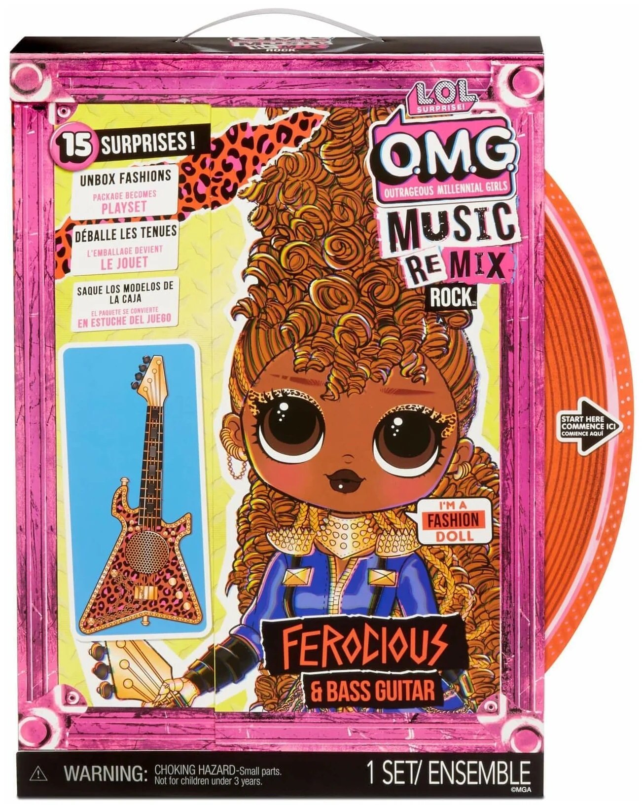 Музыкальная фэшн дива LOL OMG Remix в стиле рок по имени Ferocious. Кукла высотой 25 см прячется в необычной упаковке – боксе, который выглядит как проигрыватель. Ferocious с прической из кудрявых рыжих волос и карими глазами одета в синий пиджак с золотыми цепями, красные легинсы с леопардовым принтом, на ногах высокие ботфорты на синей подошве с леопардовым принтом. Музыкальный инструмент – басс-гитара.