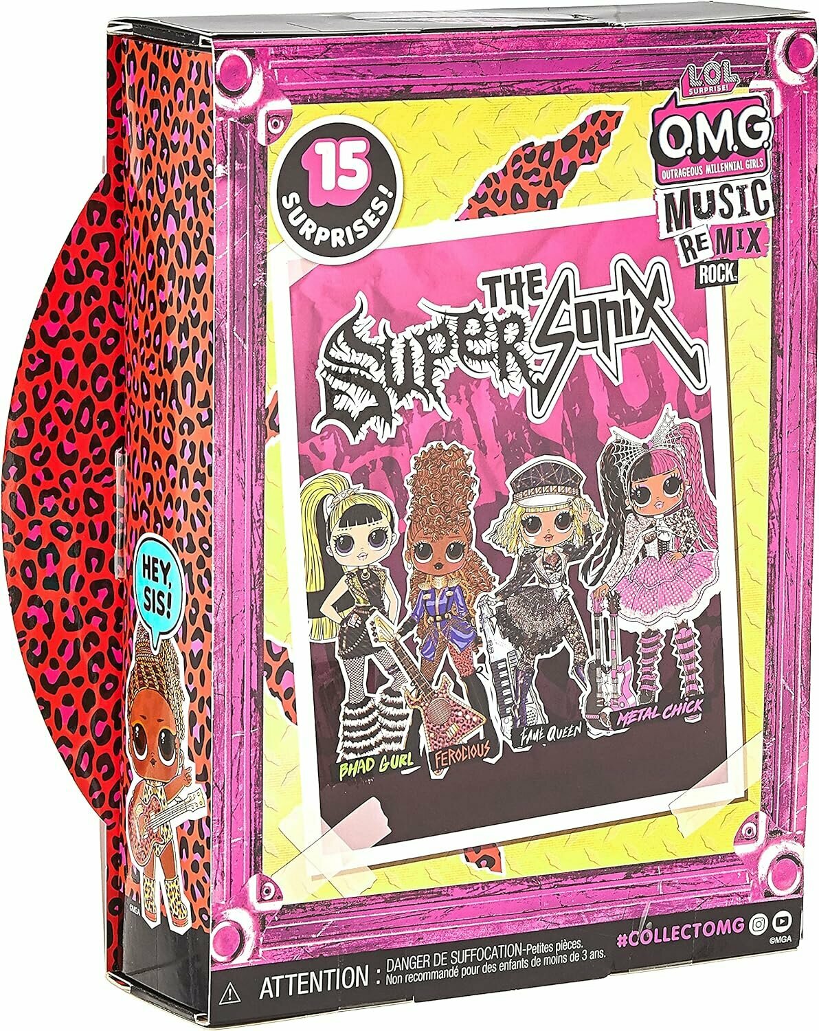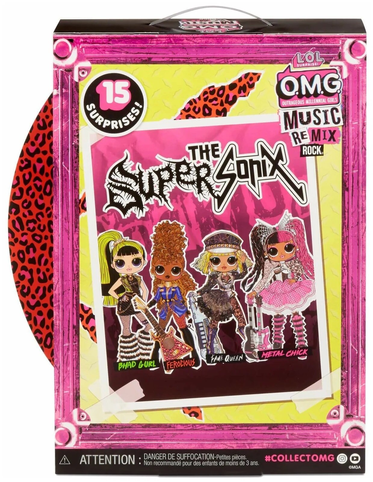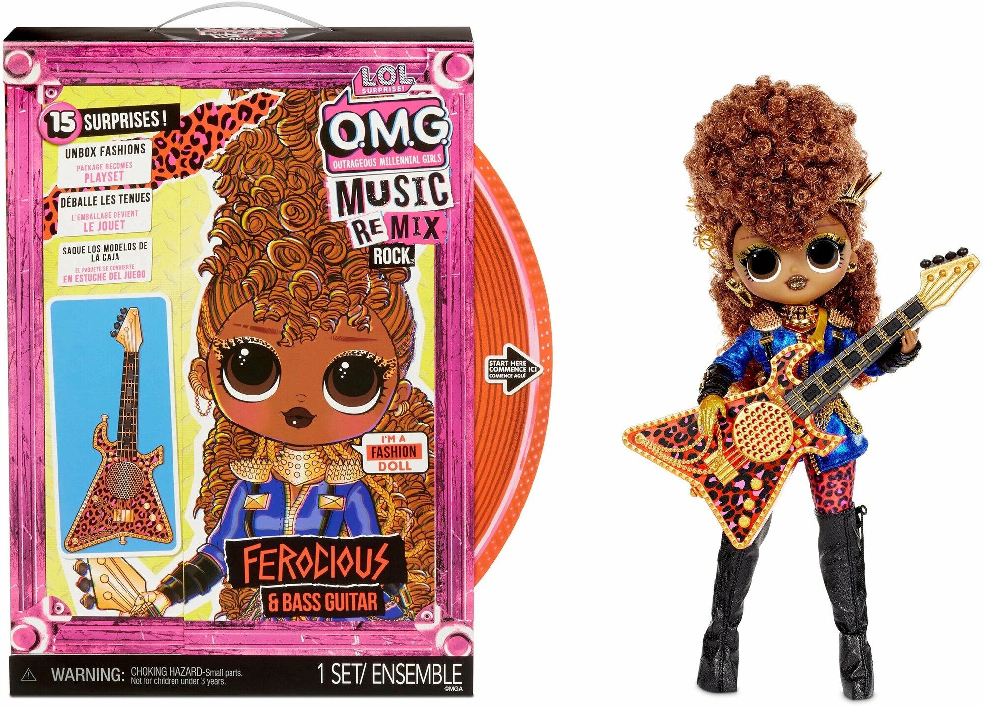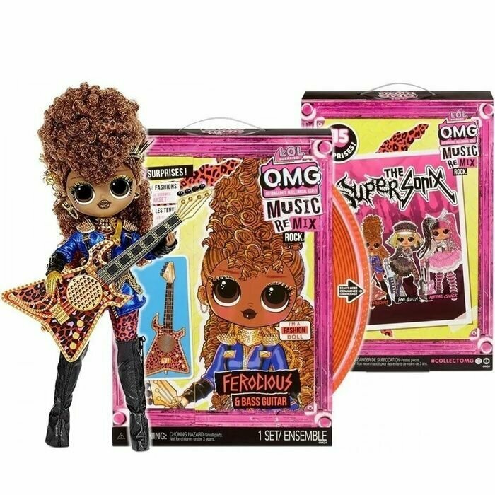 Музыкальная фэшн дива LOL OMG Remix в стиле рок по имени Ferocious. Кукла высотой 25 см прячется в необычной упаковке – боксе, который выглядит как проигрыватель. Ferocious с прической из кудрявых рыжих волос и карими глазами одета в синий пиджак с золотыми цепями, красные легинсы с леопардовым принтом, на ногах высокие ботфорты на синей подошве с леопардовым принтом. Музыкальный инструмент – басс-гитара.