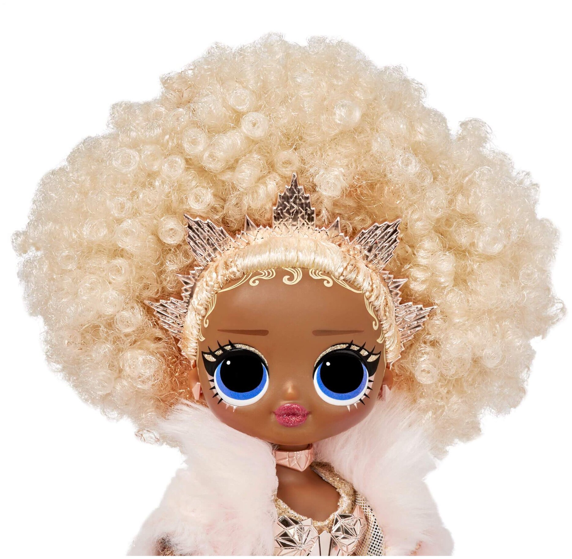 Удивительная куколка LOL OMG 2021 Holiday с синими большими глазами и кудрявыми светлыми волосами, собранными в высокий хвост – настоящая фэшн дива.