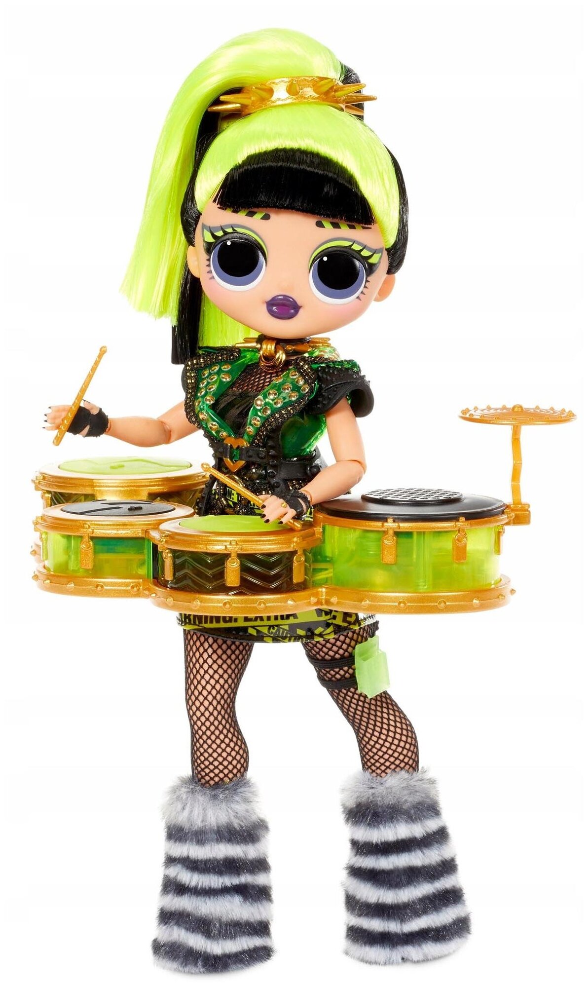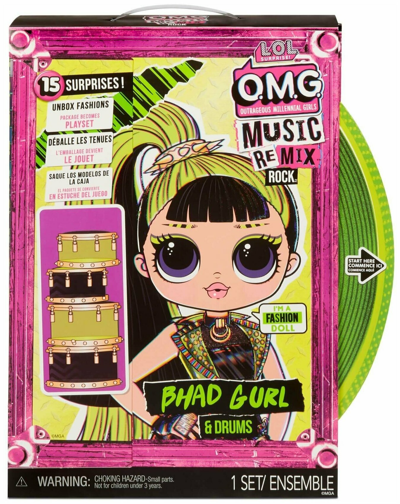 Музыкальная фэшн дива LOL OMG Remix в стиле рок по имени Bhad Gurl. Кукла высотой 25 см прячется в необычной упаковке – боксе, который выглядит как проигрыватель. Bhad Gurl с салатово-черными волосами, убранными в хвост, и синими глазами одета в зеленое короткое платье, сетчатые колготки и меховые сапожки. Музыкальный инструмент – барабанная установка.