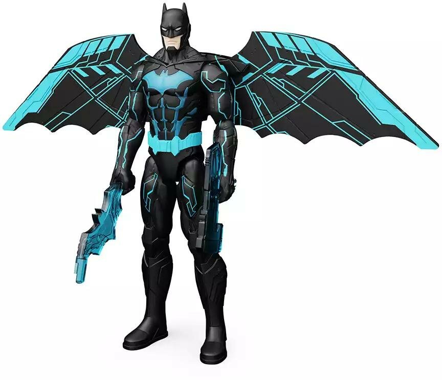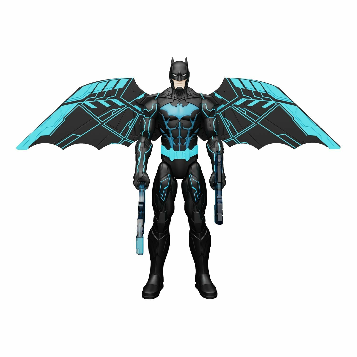 Интерактивная фигурка Бэтмена Бэт-тех в костюме и маске черно-бирюзового цвета и большими крыльями на спине. Шарнирные часты туловища, 7 точек артикуляции, благодаря чему фигурка может принимать разные позы. С помощью рычага на спине крылья можно раскрывать и трансформировать, а подняв рычаг вверх спрятать крылья обратно. Есть возможность активировать подсветку фигурки и звуковые эффекты (более 20 звуков) персонажа, если нажать на символ летучей мыши на груди. В комплекте с фигуркой 2 оружия – бластер и бэтаранг. Высота фигурки 30 см.
