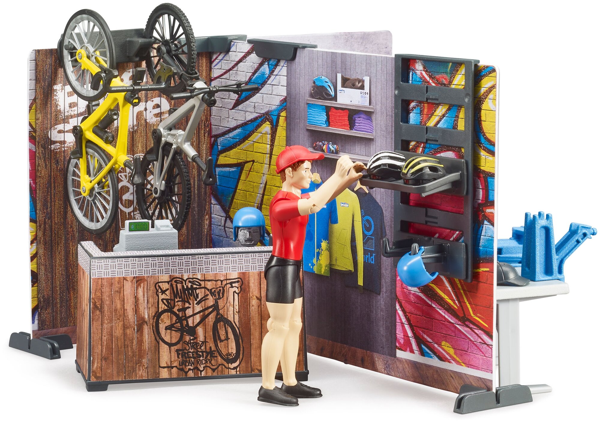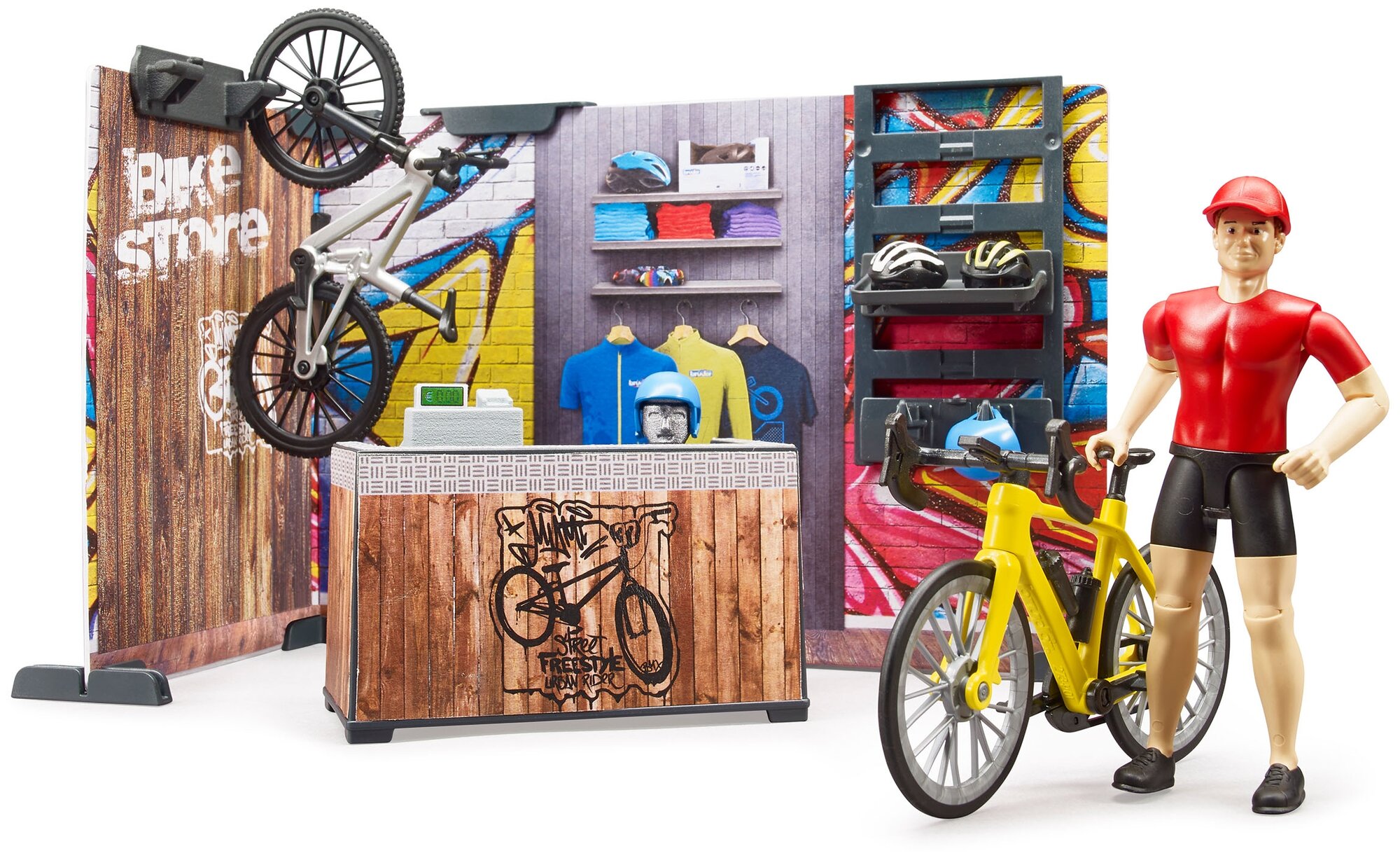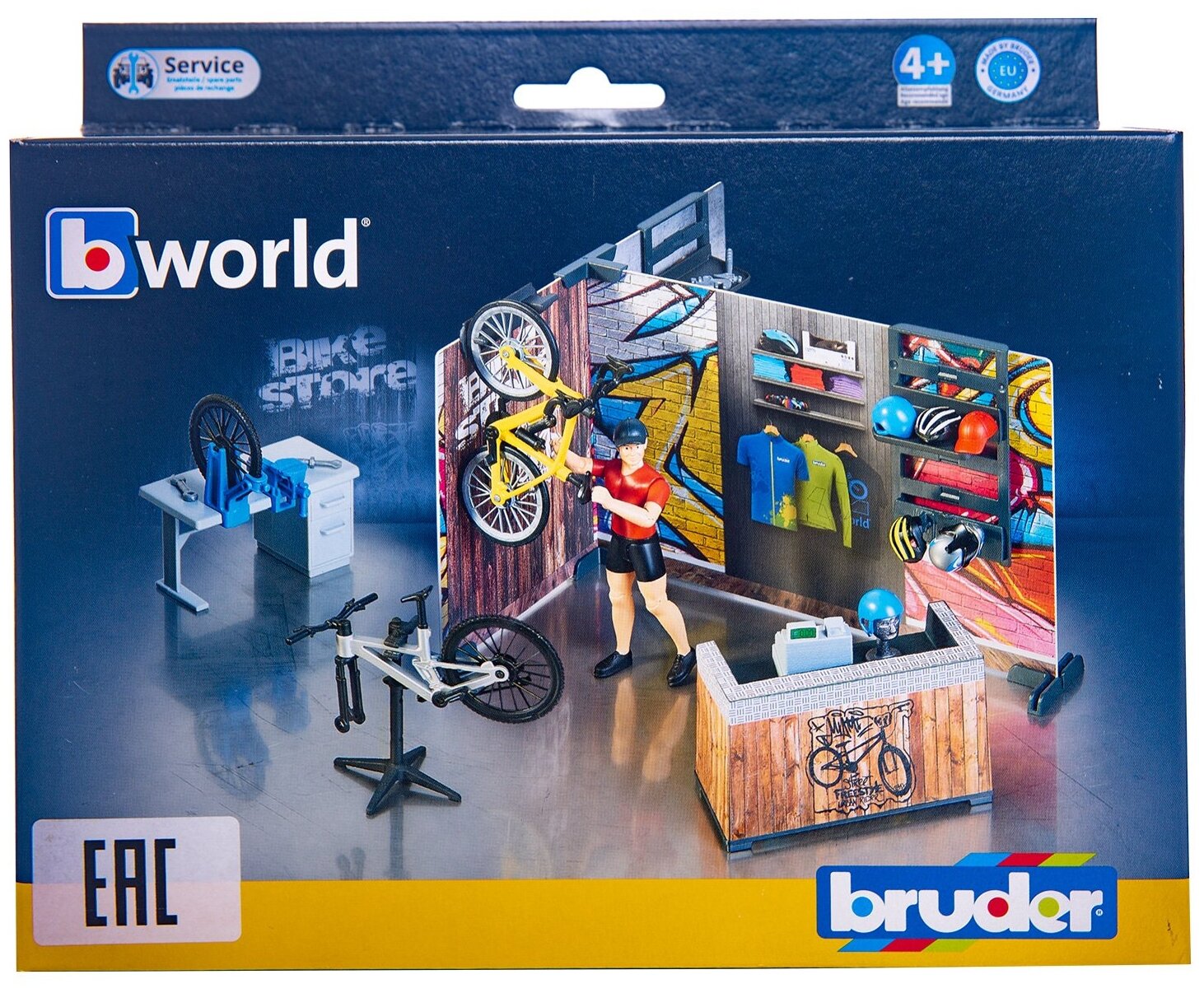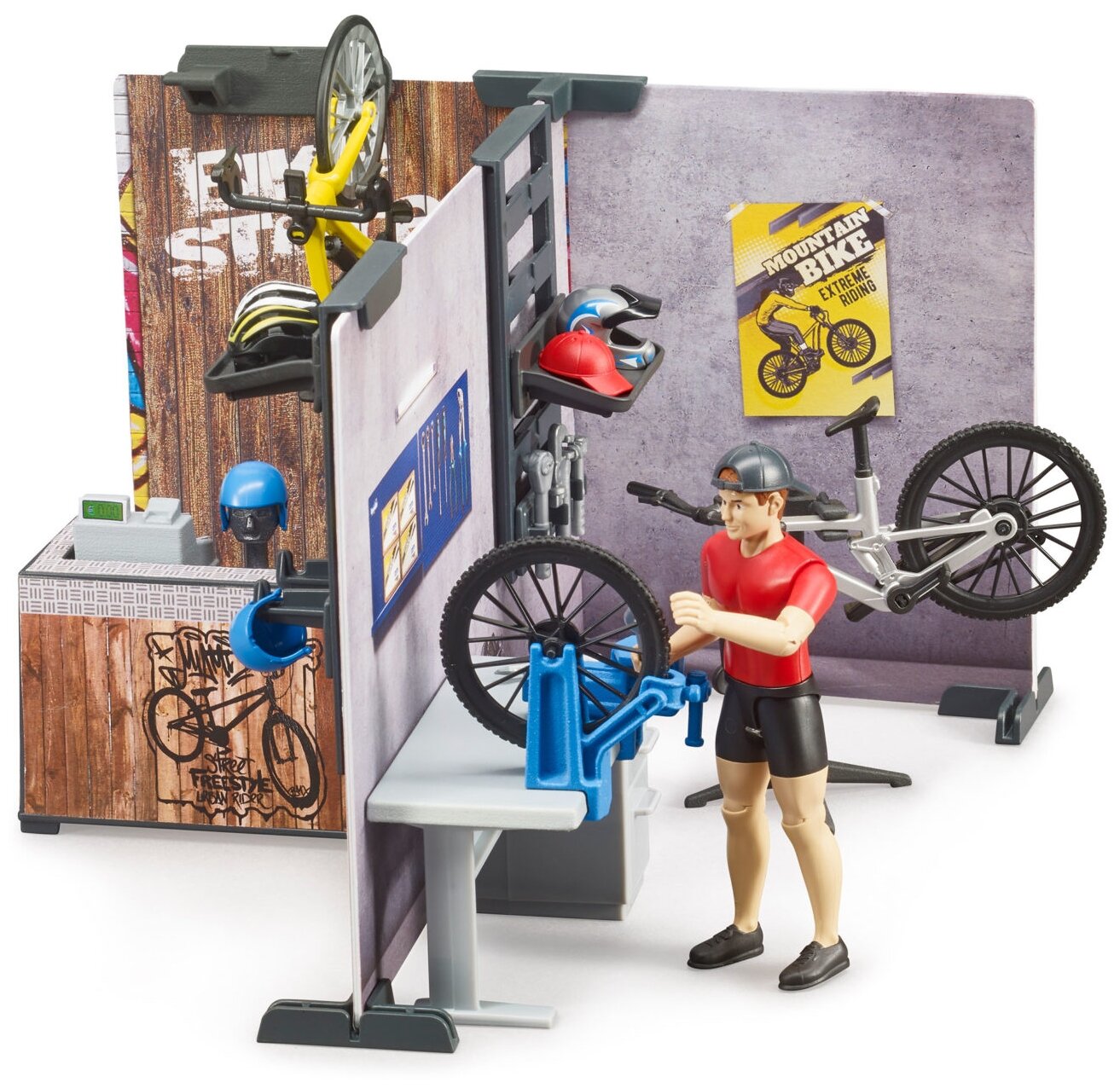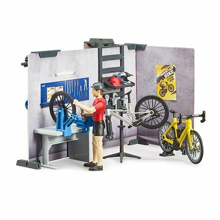 | Комплектация | 2 стены, 2 стеллажа, 2 велосипеда, человечек Bruder, аксессуары (стойка для починки колёс, стол, тиски, шлем, кепка, стойка с кассой) |