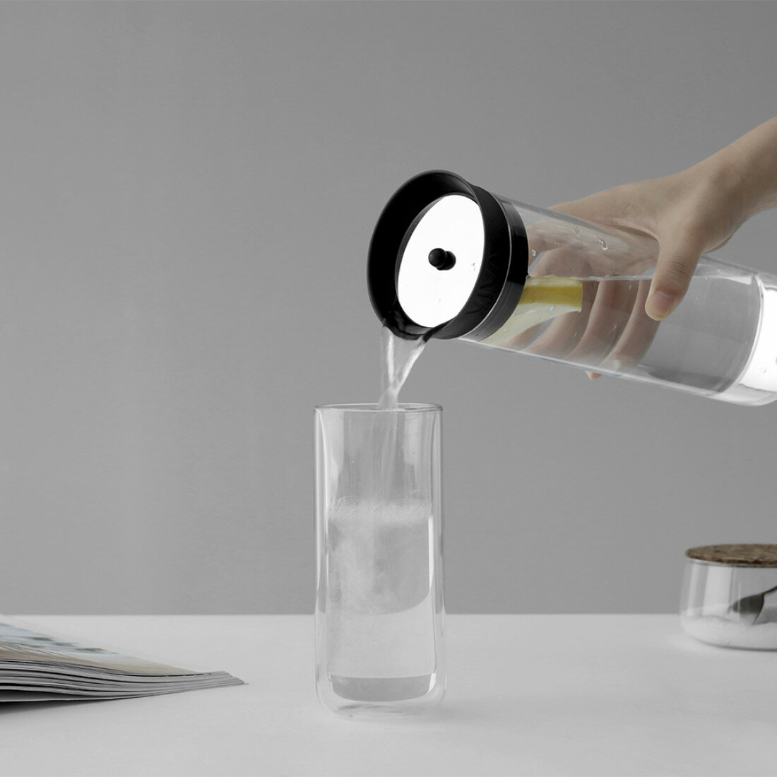 Стеклянный графин Minima – то, что нужно для подачи холодных напитков, организации компактного хранения чая или лимонада на дверце холодильника. Силиконовая крышка со специальными прорезями, которые служат фильтром задерживает фрукты, ягоды, оставляя крупные ингредиенты в графине.