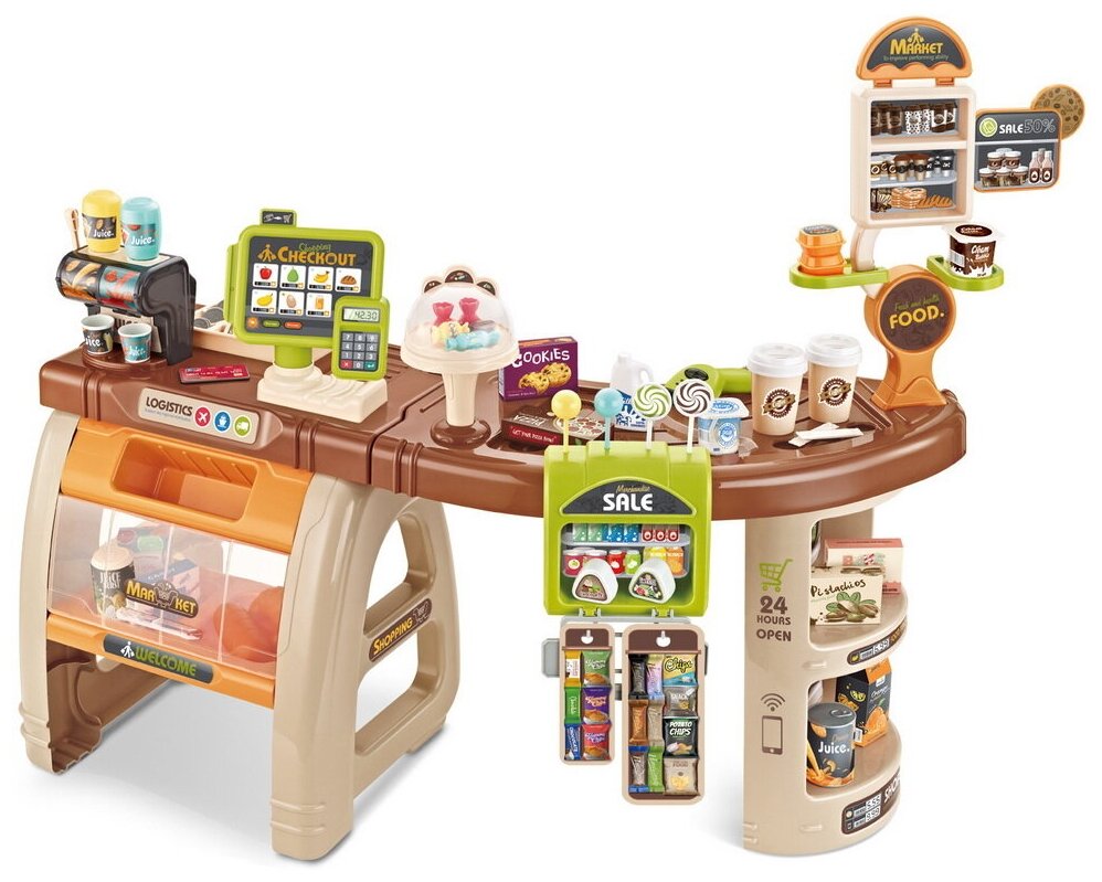 Игровой набор имитирует профессиональный, современный супермаркет с кассой и,безусловно, будет идеальным подарком для ребенка.В наборе 52 элемента.Супермаркет имеет множество аксессуаров, таких как: кассовый аппарат, сканер, а также - весы; фрукты; овощи; различные напитки и продукты.