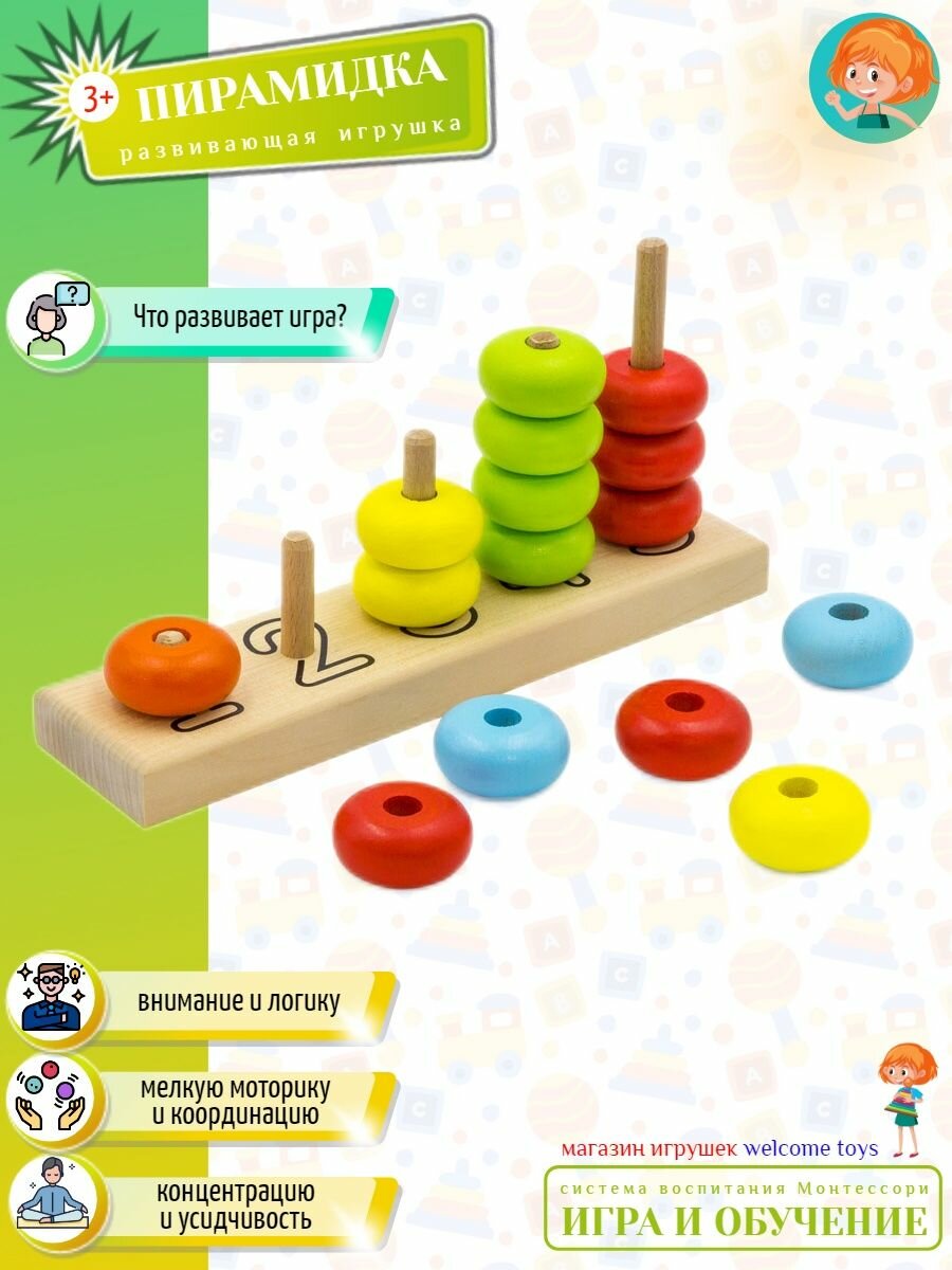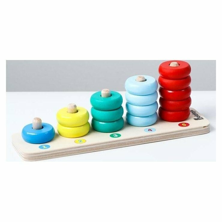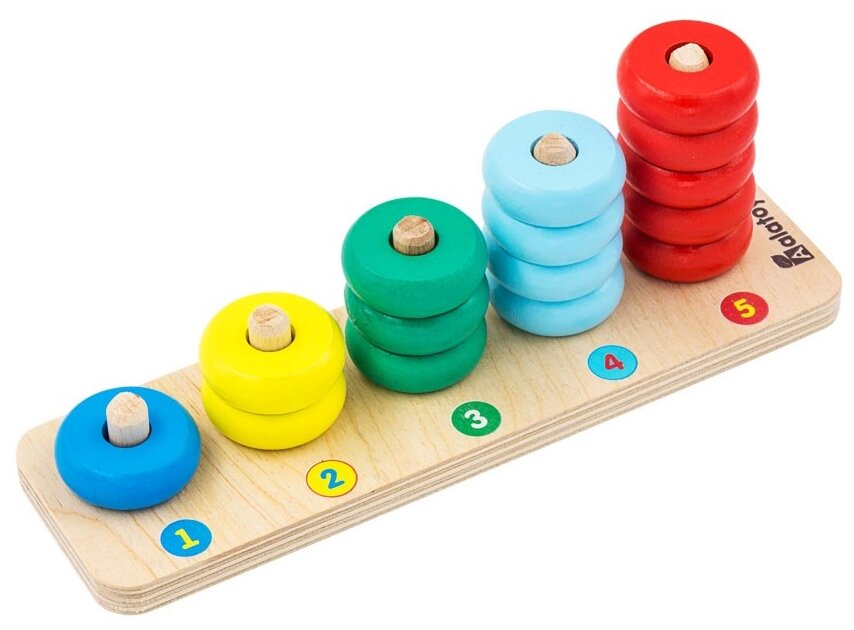 Пирамидка - развивающая игрушка от Алатойс, представляющая собой деревянную основу с 5 шкантами и 15 колец для нанизывания. Основная задача: нанизать кольца на штыри в соответствии с оттенками основного цвета.