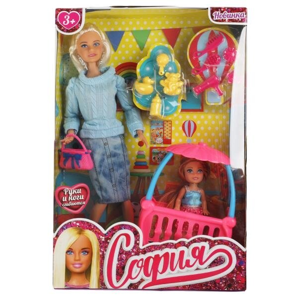 Модница-София одета в стильный голубой джемпер и юбку-карандаш, образ дополнен изящными серьгами и сумочкой. Её малышка выбрала в качестве наряда красивое платье. С такими модными куклами девочке будет интересно и весело играть: благодаря тому, что руки и ноги Софии подвижны, им можно придать любое положение. У Софии и её дочки длинные красивые волосы, которые хозяйка куклы сможет заплетать в разные причёски. Детально проработанный дизайн игрушки вдохновит девочку на новые игровые сюжеты.
