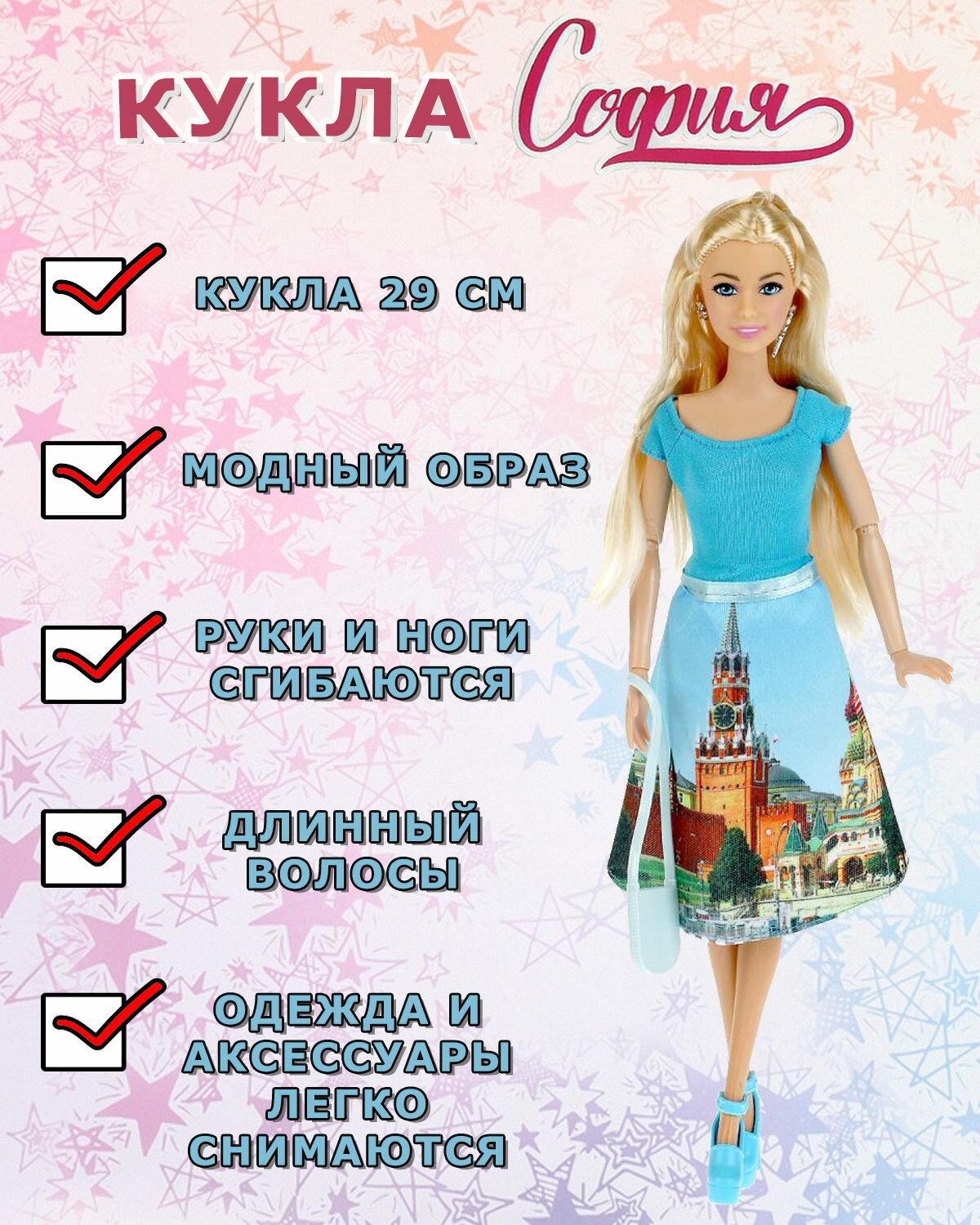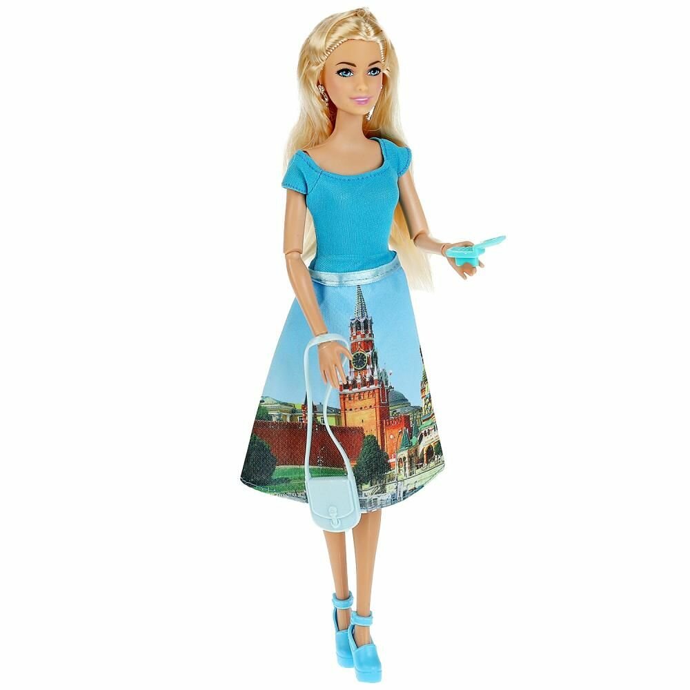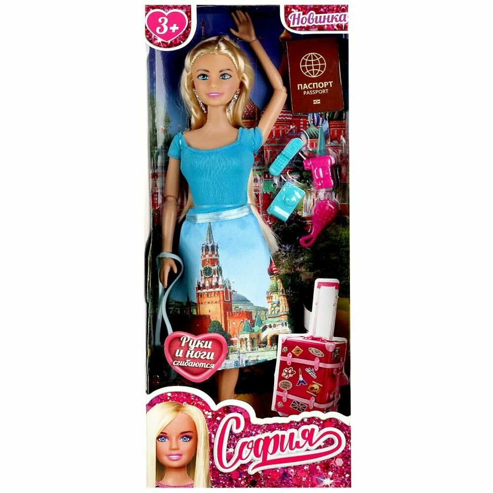 Модная путешественница София одета в элегантную голубую юбку с принтом, на котором изображены виды Москвы и кофточку в тон. Образ куколки дополняют изящные серьги и сумочка. Одежду и аксессуары легко снять и надеть. С такой модной куклой девочке будет интересно и весело играть: благодаря тому, что руки и ноги куклы подвижны, им можно придать любое положение. У Софии длинные красивые волосы, которые хозяйка куклы сможет заплетать в разные причёски. Детально проработанный дизайн игрушки вдохновит девочку на новые игровые сюжеты.