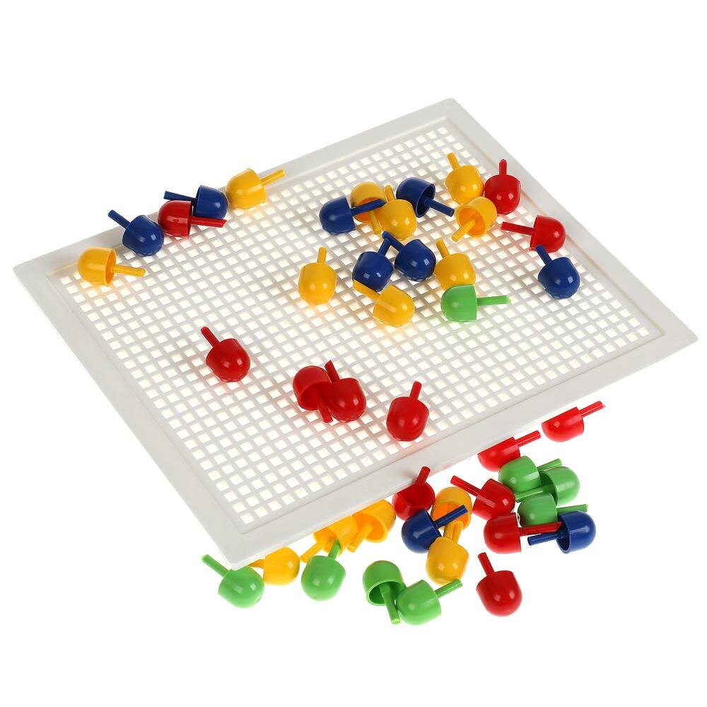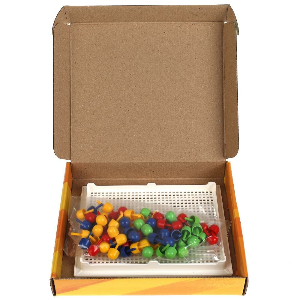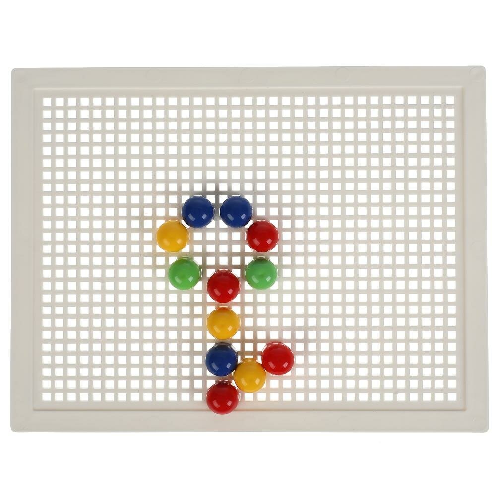 Набор состоит из прямоугольного поля-основы и разноцветных круглых пластиковых деталей, используя которые маленький любознайка сможет собрать самые разные варианты картинок.