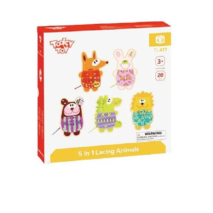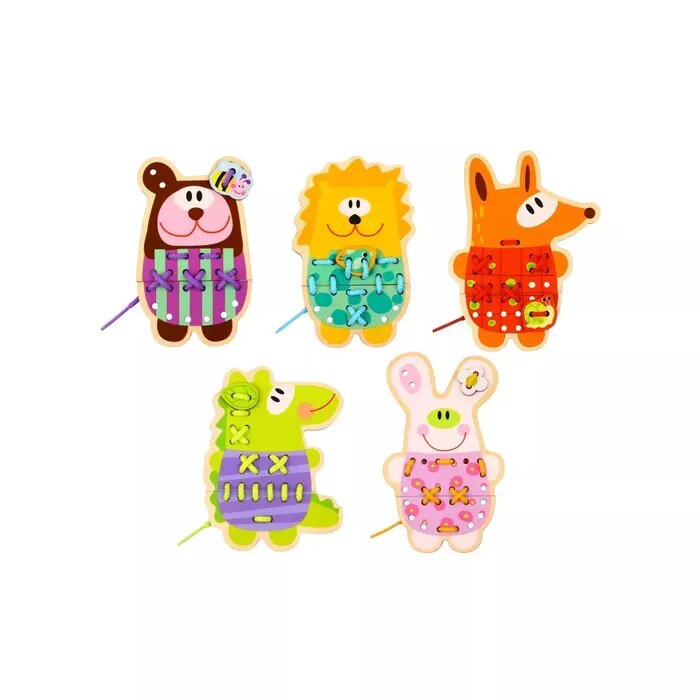 Оригинальный набор - шуровка от Tooky Toy. С этими набором малыш познакомится с миром забавных животных. В набор входит 5 различных перфорированных фигурок и 5 разноцветных шнурков.