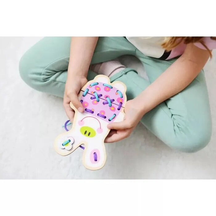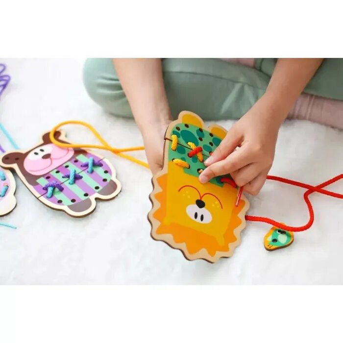Каждая фигурка состоит из 3 частей. Предложите малышу соединить пары и украсить животных аксессуарами. Игры с шнуровками развивают мелкую моторику, пространственное восприятие, логику, навыки решения проблем и дают ощущение собственных успехов и достижений.