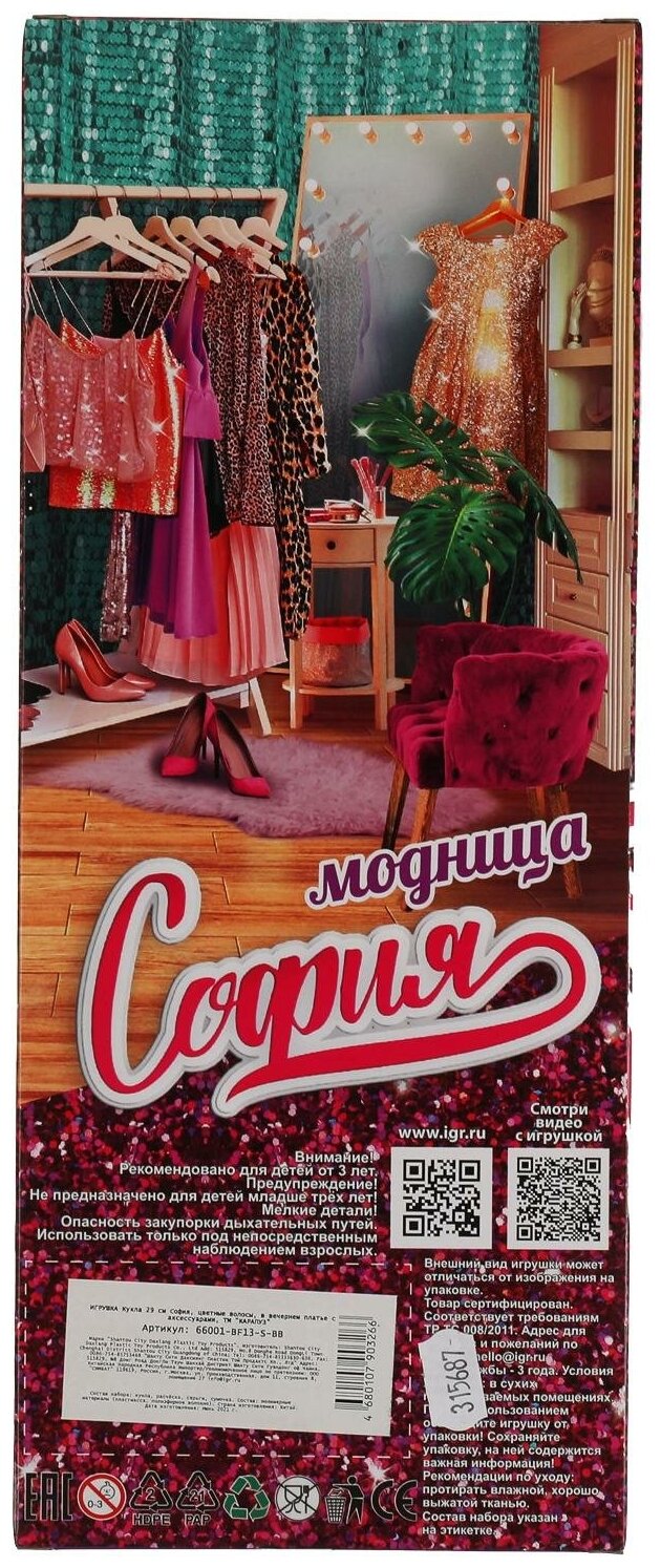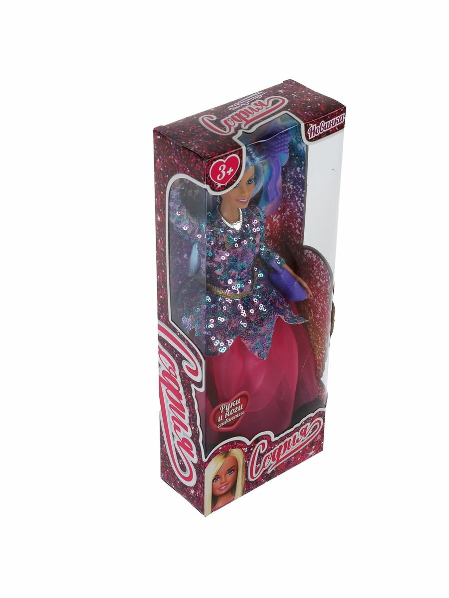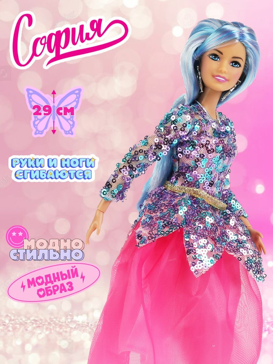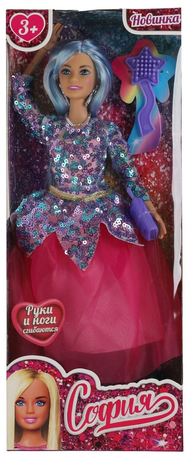 Модница-София одета в прекрасное платье с пышной юбкой и верхом из сверкающих пайеток. Образ дополняют стильные крупные серьги и элегантная сумочка. Одежду и аксессуары легко снять и надеть. С такой модной куклой девочке будет интересно и весело играть: благодаря тому, что руки и ноги куклы подвижны, им можно придать любое положение. У Софии длинные красивые волосы, которые хозяйка куклы сможет заплетать в разные причёски. Детально проработанный дизайн игрушки вдохновит девочку на новые игровые сюжеты.