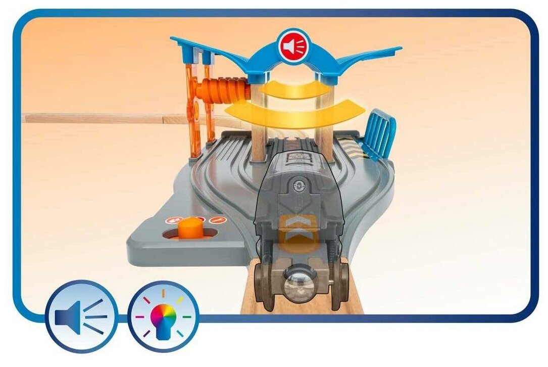 Станция технического обслуживания поездов предлагает полный спектр услуг для всех поездов BRIO World, проходящих через нее. При проезде под аркой, воспроизводятся звуковые эффекты и автоматически включаются фары локомотива.