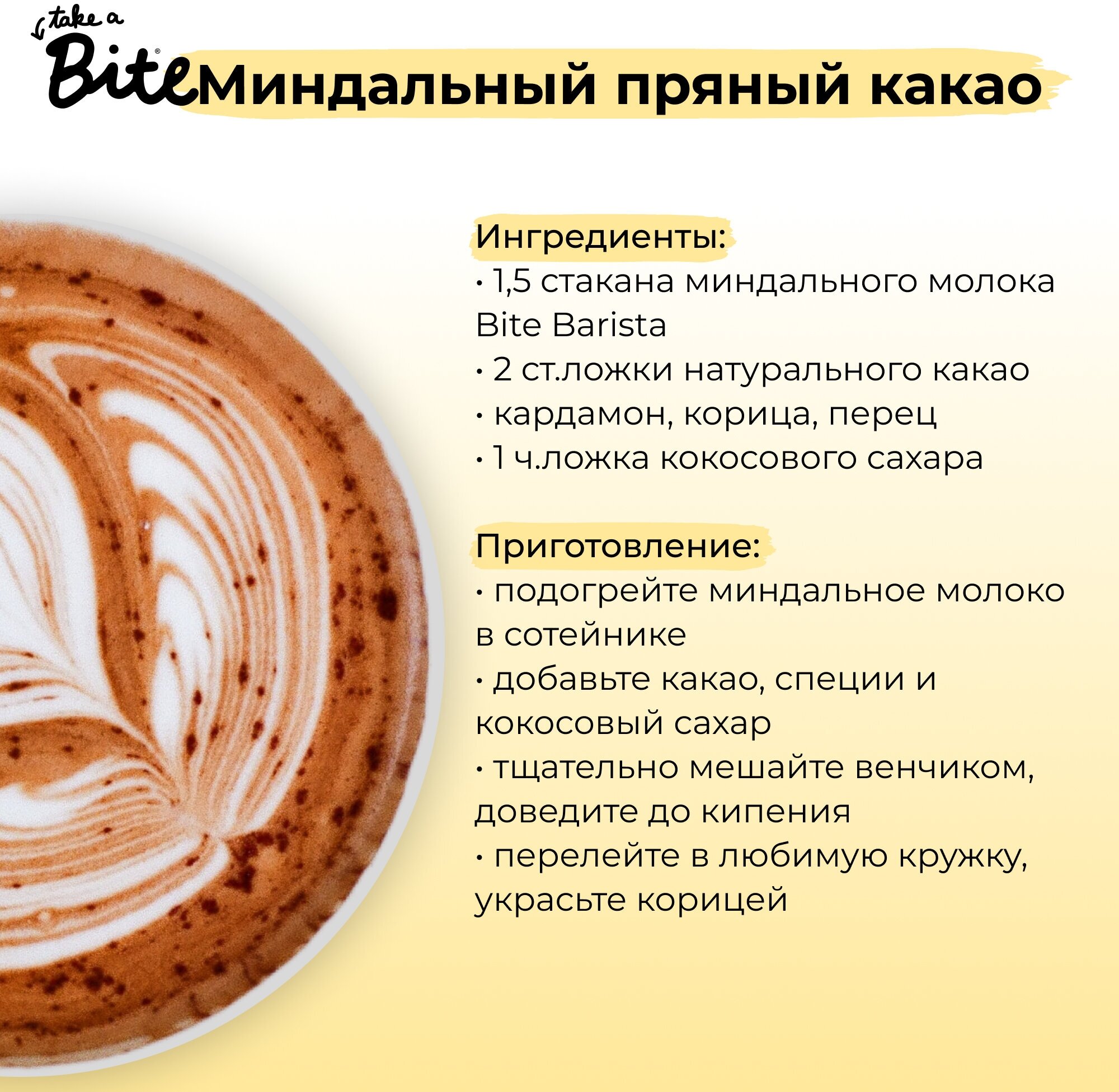 Миндаль - благородныи? орех. Его насыщенныи? вкус усилит аромат кофе и раскроет все нотки кофеи?ного зерна. Для создания этого напитка мы использовали только натуральные ингредиенты, чтобы ваш латте или капучино был не просто бодрящим, но и полезным. Один кофе на миндальном Bite Barista - и вы забудете про классическии? вариант! Приготовление кофе - это искусство. И мы хотим, чтобы оно было доступно каждому, поэтому сварили почти 400 кружек капучино, пока разрабатывали линеи?ку Bite Barista. Наше растительн
