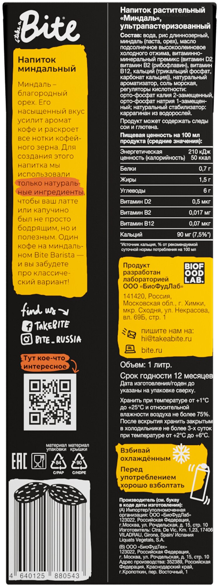 Напиток растительный миндальный Bite "Бариста" ультрапастеризованный 1л (П102-БФ-00001736)