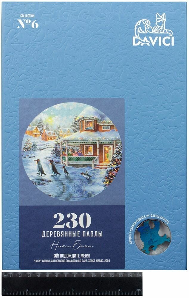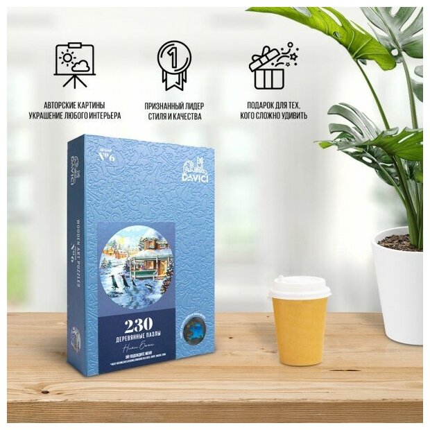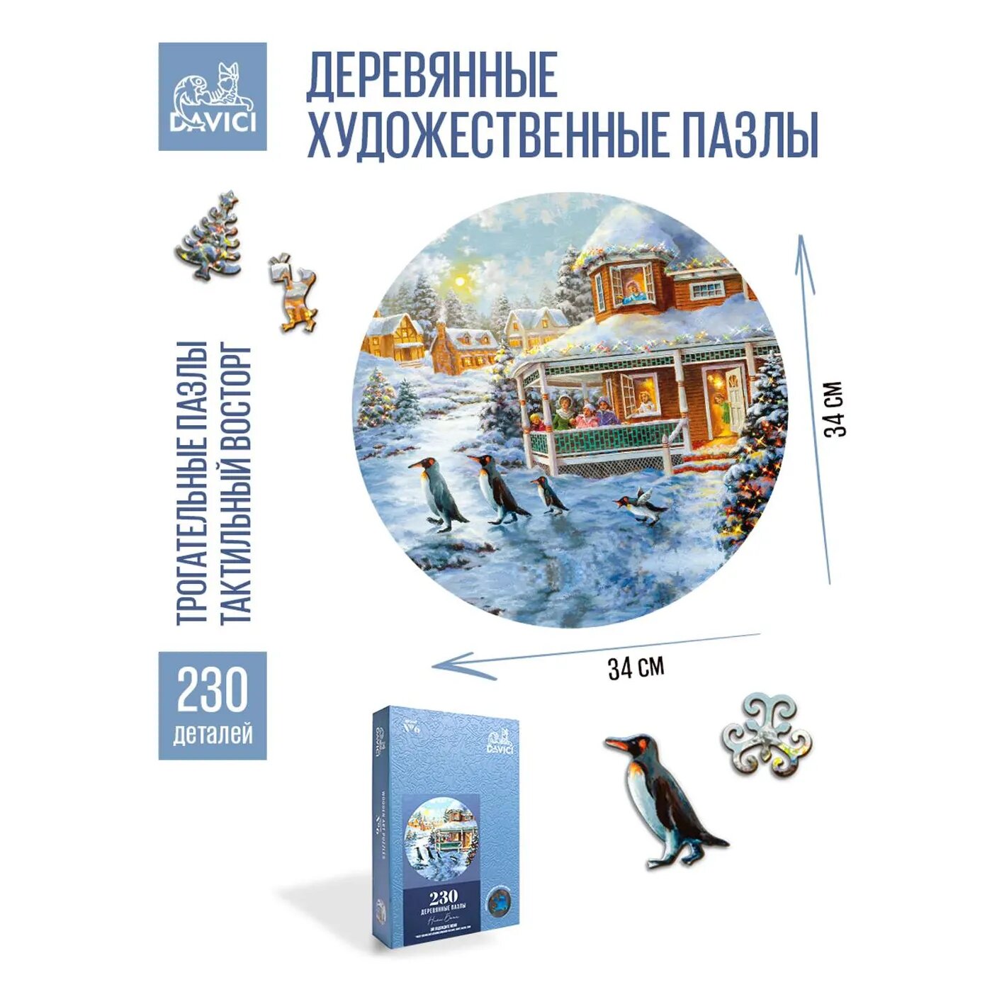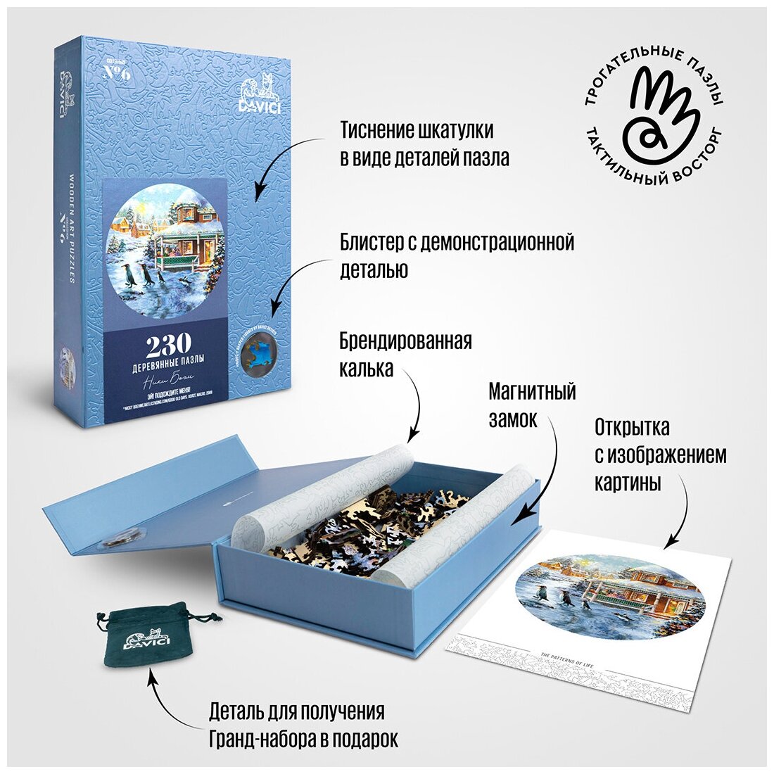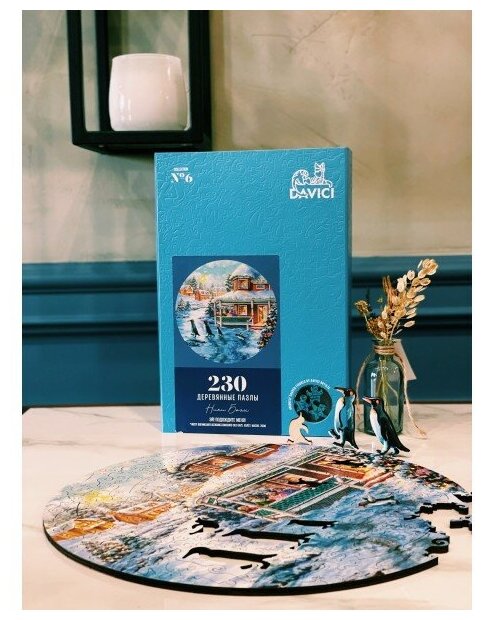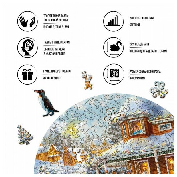Красивый новогодний пазл. Деревянные детали вырезаны в виде разных фигурок, сделаны очень качественно, прорезаны аккуратно и не пачкают руки краской. Коробка, в которой лежат пазлы, оформлена красиво, прочная, с магнитным замком, внутри пазлы упакованы в фирменную кальку.
