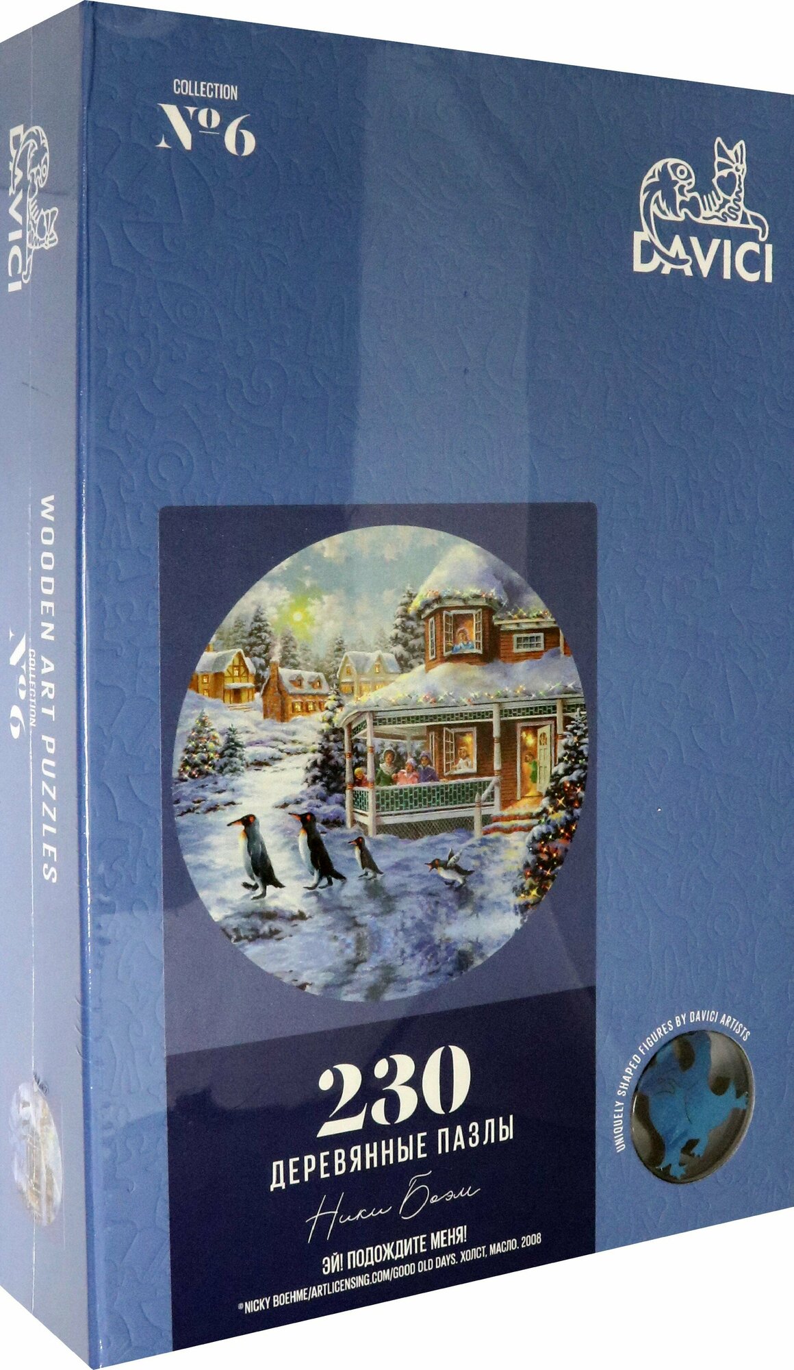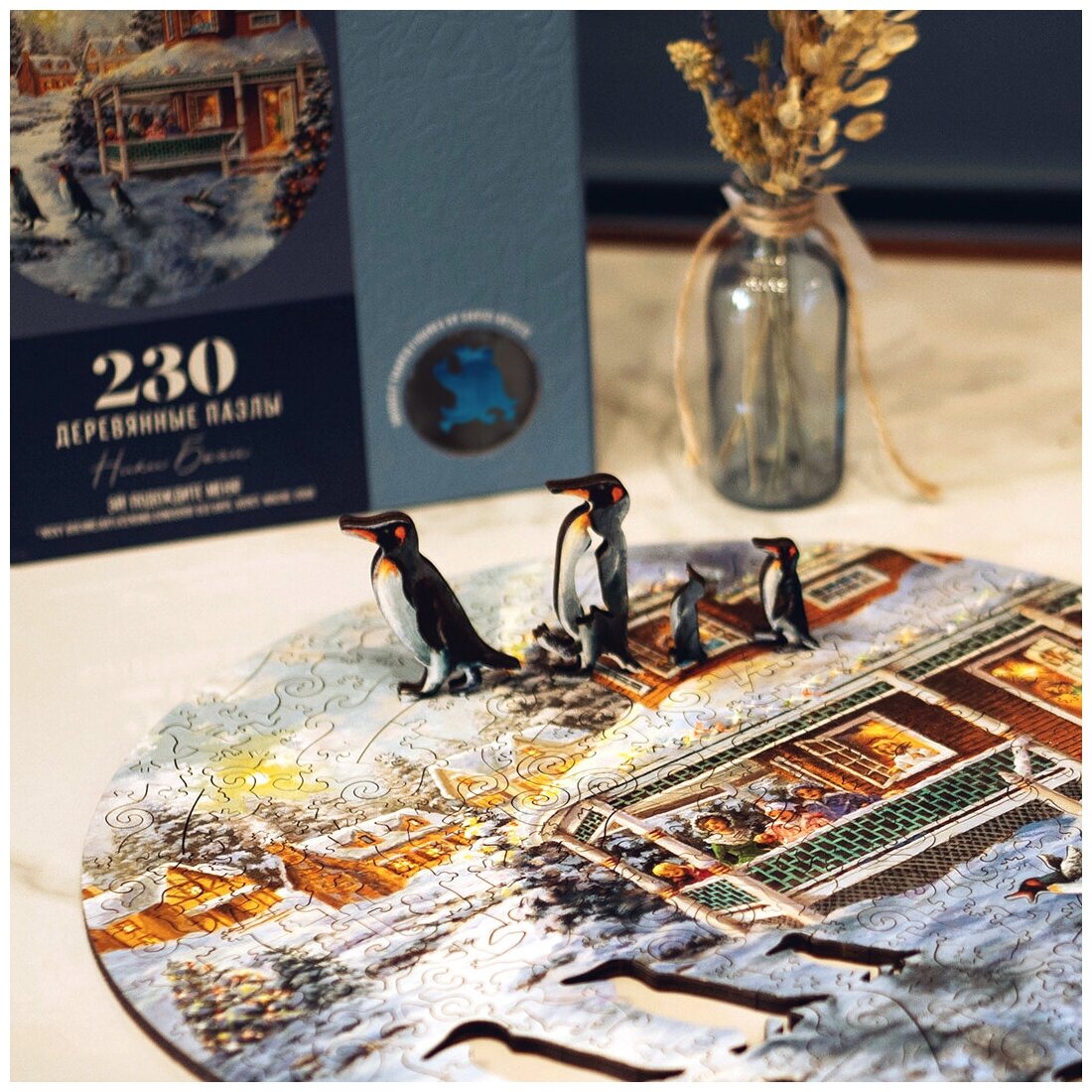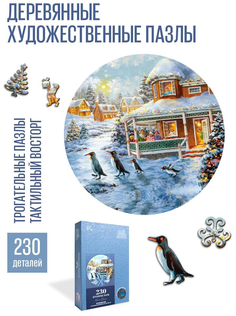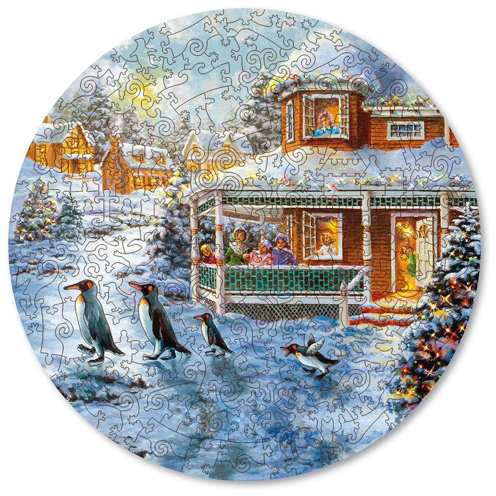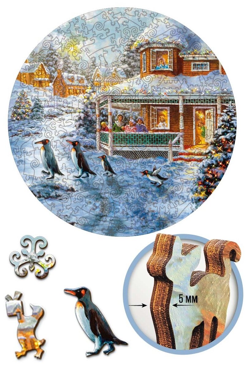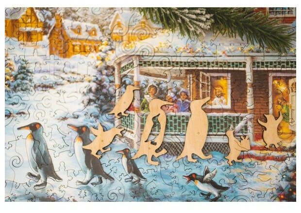 В деревянных деталях пингвины оживают в смешных рождественских сюжетах. Пингвины выскочили за пределы картины и оказались в большой загадке из 32 деталей. Удастся ли вам разгадать секрет пазла и узнать, сколько пингвинов выскочило из картины?