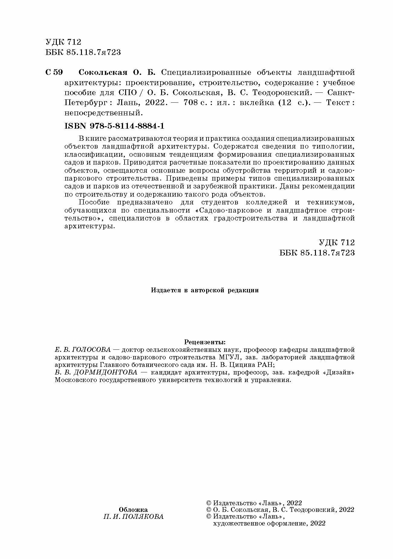 Специализированные объекты ландшафтной архитектуры. Проектирование строительство содержание. СПО (Теодоронский Владимир Сергеевич, Сокольская Ольга Борисовна); Лань, 2022