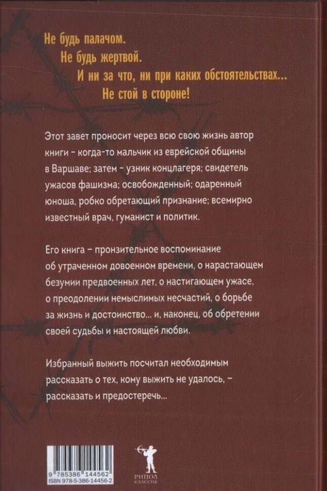 Этот завет проносит через всю свою жизнь автор книги - когда-то мальчик из еврейской общины в Варшаве; затем - узник концлагеря; свидетель ужасов фашизма; освобожденный; одаренный юноша, робко обретающий признание; всемирно известный врач, гуманист и политик. Его книга - пронзительное воспоминание об утраченном довоенном времени, о нарастающем безумии предвоенных лет, о настигающем ужасе, о преодолении немыслимых несчастий, о борьбе за жизнь и достоинство. и, наконец, об обретении своей судьбы и настоящей любви.