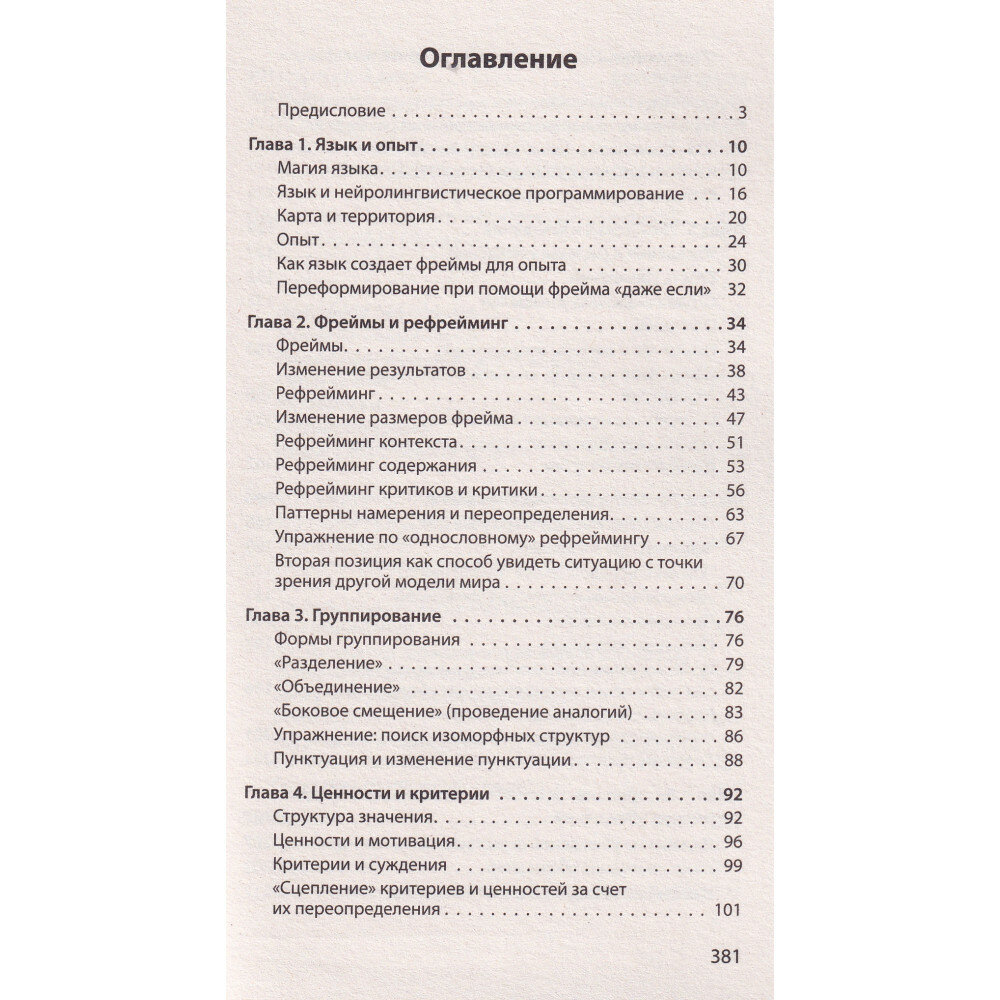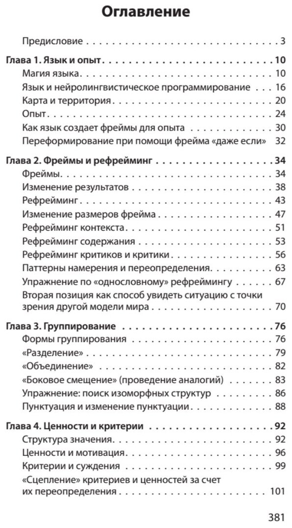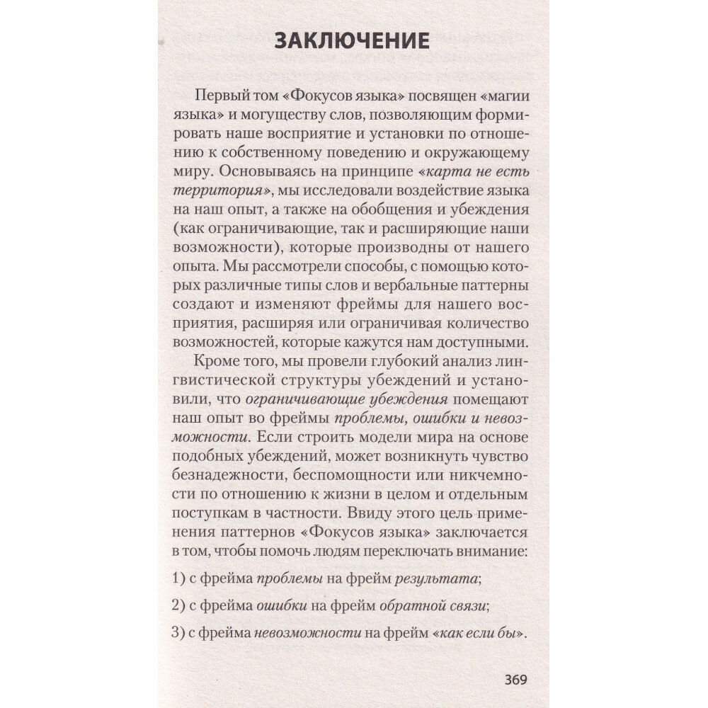 Смысл в том, что определенные речевые шаблоны (паттерны) способны преобразовывать убеждения и восприятие какой-либо ситуации, кардинально изменяя наши реакции на нее. За три десятилетия, прошедшие с момента их открытия, «фокусы языка» заслужили право называться самым эффективным методом влияния и лучшим средством изменения убеждений в процессе общения.