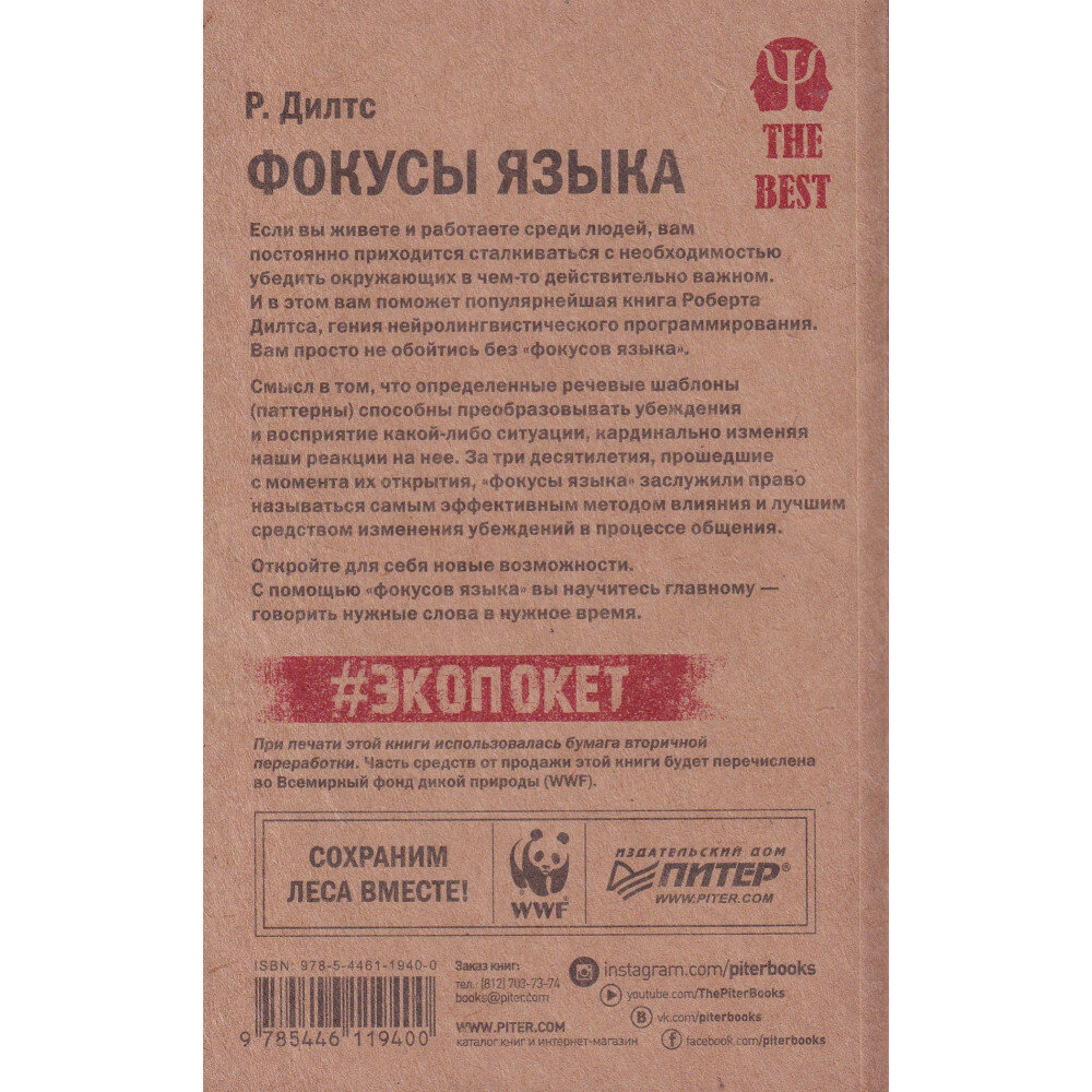 На сегодняшний день товар «Книга: Фокусы языка. Изменение убеждений с помощью НЛП (Роберт Дилтс); Издательский дом "Питер", 2024» можно купить с кешбеком в 4 магазинах: book24, Буквоед, Яндекс.Маркет, Читай-город