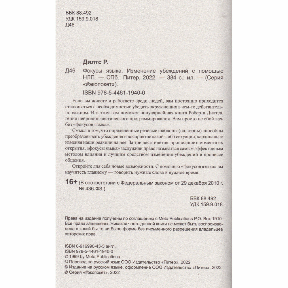 Фокусы языка. Изменение убеждений с помощью НЛП (Роберт Дилтс); Издательский дом "Питер", 2024