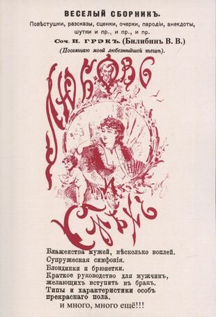Репринт с издания. СПб., 1882. Любовь и смех (Веселый сборник). Повестушки, рассказы, сценки, очерки, пародии, анекдоты, шутки и пр. и пр. и пр. (Посвящаю моей любезнейшей теще). Сочинил И. Грэк [псевд.]. Содержание: Блаженства мужей, несколько воплей. Супружеская симфония; Блондинки и брюнетки; Краткое руководство для мужчин, желающих вступить в брак; Типы и характеристики особ прекрасного пола; и много, много ещё!!! Билибин, Виктор Викторович (1859—1908) — русский прозаик, драматург, журналист и чиновник. Признанный мастер малых жанров журнальной прозы: его фельетоны, экспромты, каламбуры и пародии были особенно популярны в начале 1880 годов и высоко ценились Чеховым. С 1885 года был знаком с Чеховым, на протяжении пятнадцати лет между ними велась откровенная переписка. В 1906—1908 годах, после смерти Н. А. Лейкина, был редактором-издателем «Осколков». В 1890—1900 годах возглавлял международный отдел в Главном управлении почт и телеграфов. Действительный статский советник. Тираж 30 экз. выполнен по технологии print-on-demand.