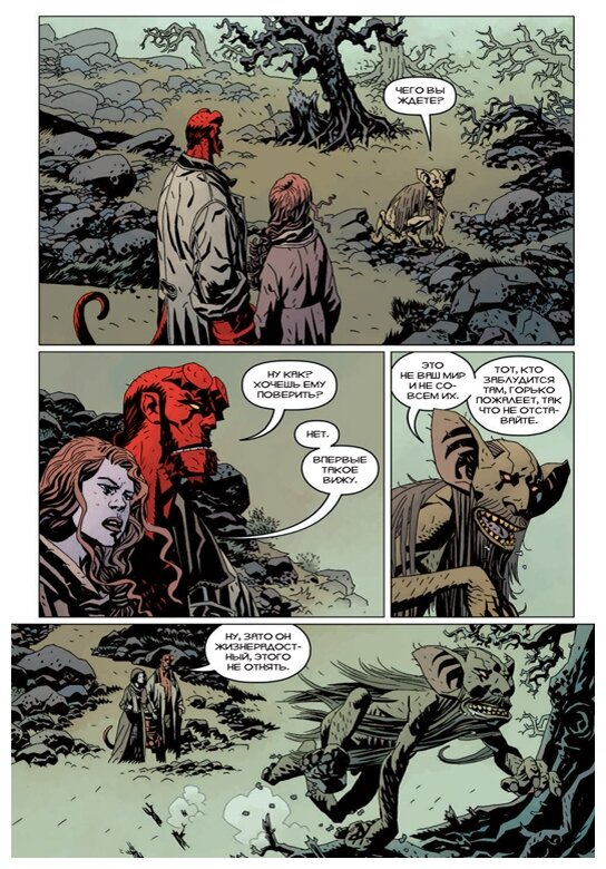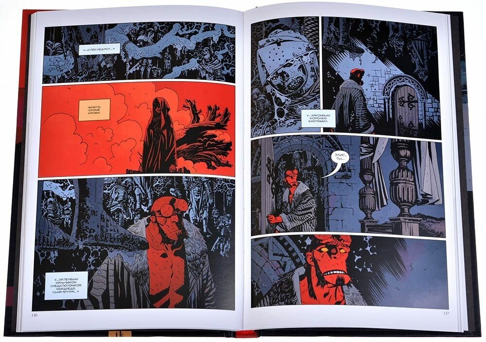 Это наверное самое сильное, мощное произведение про Хеллбоя, соединяющее в себе кучу всевозможных мифов, легенд и историй разных культур и народов. Даже удивительно, как всё это уживается на страницах комикса Майка Миньолы, но мало того, что уживается, так от этого невозможно оторваться. Как всегда великолепна графика и минимальное количество цветов в комиксе.