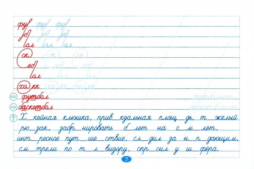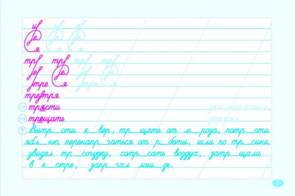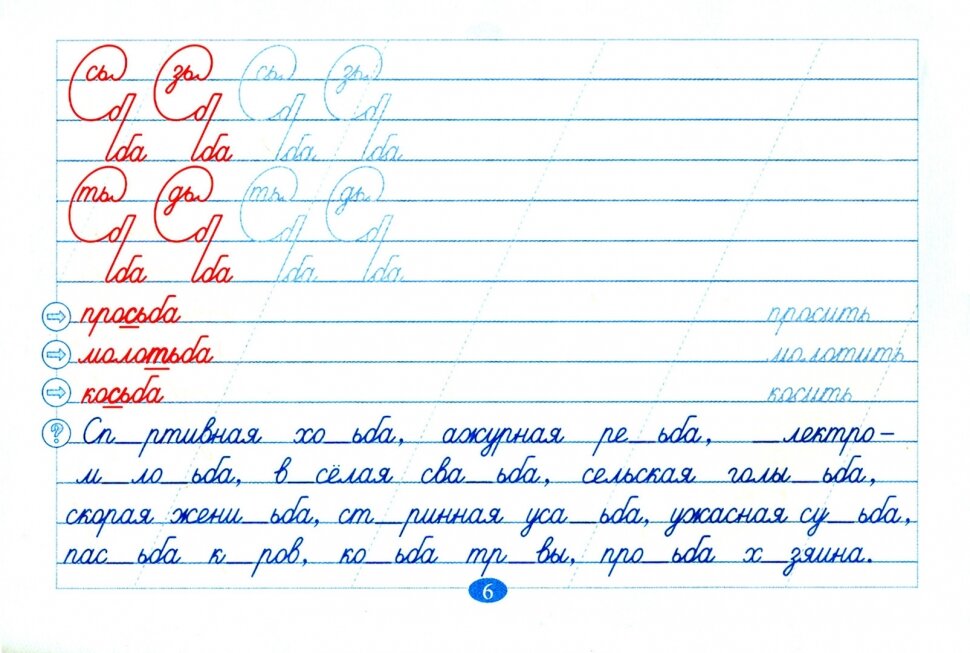 Основу чистописания составляют росчерки - с ни? начинается каждая страница. Их цель - отработать соединения букв, которые лежат в основе словарных слов или слов по теме урока. Слова могут быть собраны и в лексическую группу по теме урока.