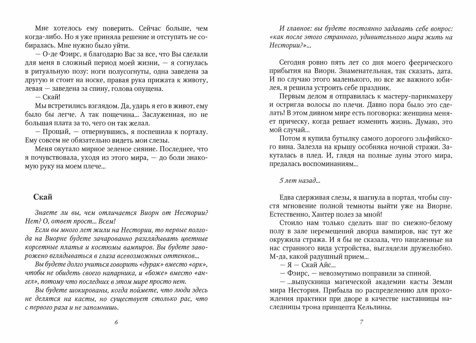 В конце первои? книги, Скаи? не выдерживает натиска правды, что открыла еи? глаза на жизни и на мужа, и она сбегает к своеи? подруге Кель в другои? мир, где должна проходить практику мага, а заодно привести свои мысли в порядок и на время отои?ти от накопившегося груза проблем и обид.