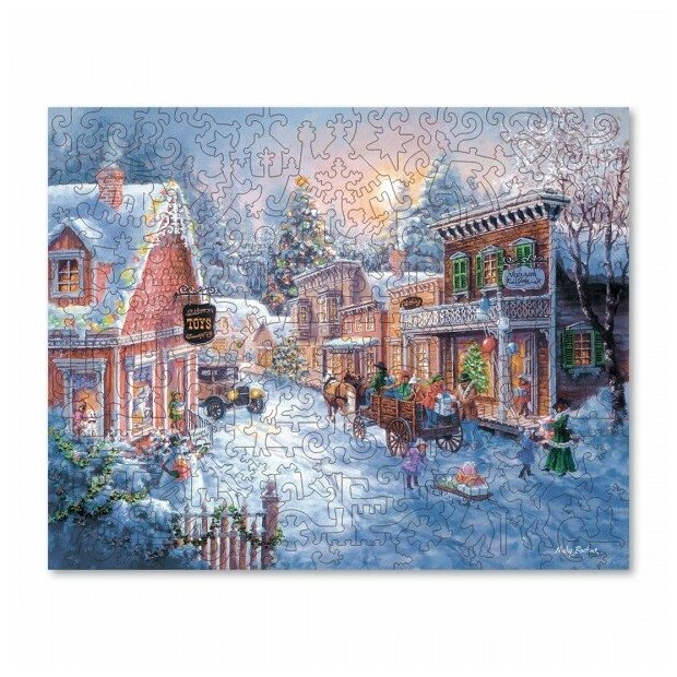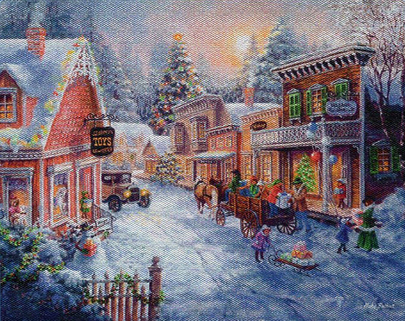 На душевной картине американской художницы Ники Боэм - Рождественский вечер 20-х годов 19 века. Художница Наталья Макарук углубилась в тему прошлого, где присутствуют разнообразные герои атрибуты зимнего праздника 19 века. Деревянные детали позволяют переместиться в прошлое и взглянуть на картинку глазами очевидца событий.