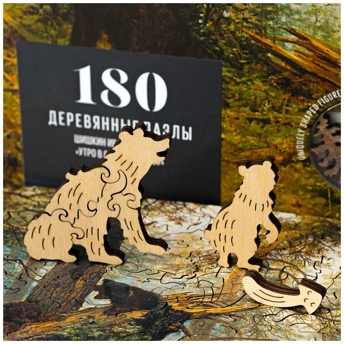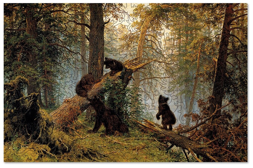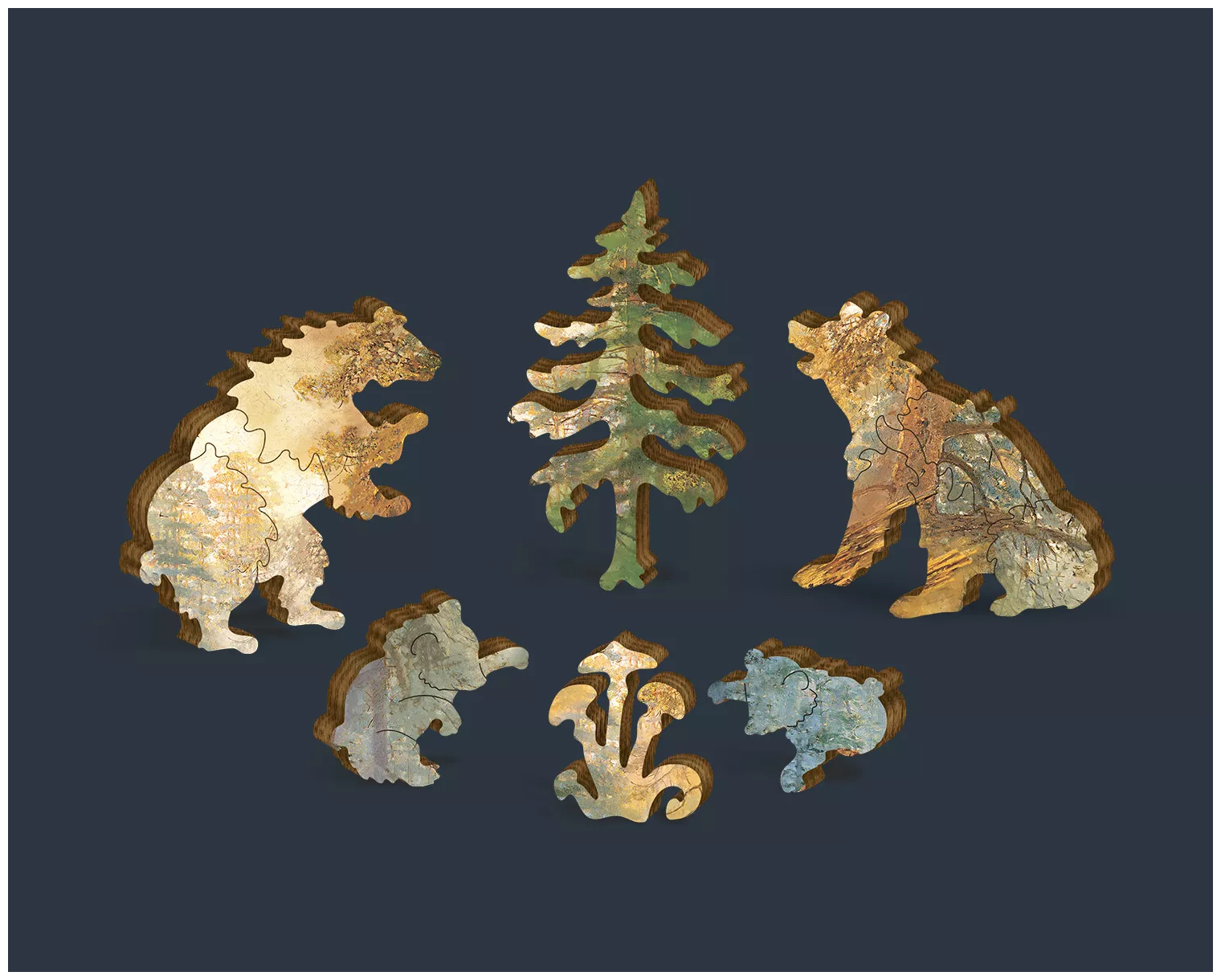 Стильно оформленный в лесных сюжетах пазл знакомит с жизнью медвежьего семейства и жителей леса. Главная загадка набора: берлога со спрятавшимися в ней медвежатами. Загадка откроется в картине, если вынуть "лишние" детали из берлоги. А вынув из картины все детали загадки и выложив их отдельно цветной стороной, вы увидите композицию во всей своей красе.
