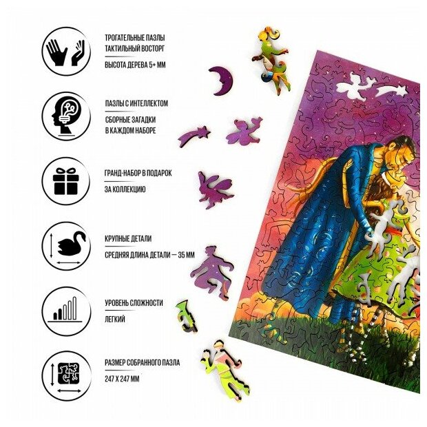 Внутри пазла художники DAVICI поселили очаровательную семейку из человечков в "наивном" стиле Марианы Калачевой. Влюбленные парочки и счастливые семейки, крылатые животные, месяц и звезды - целый мир, наполненный вдохновляющими картинами жизни! Две главные загадки: разборные фигуры неожиданных героев. Переверните их на цветную сторону. Детали соединены зацепами в виде фламинго, единорогов и прыгающих кроликов.