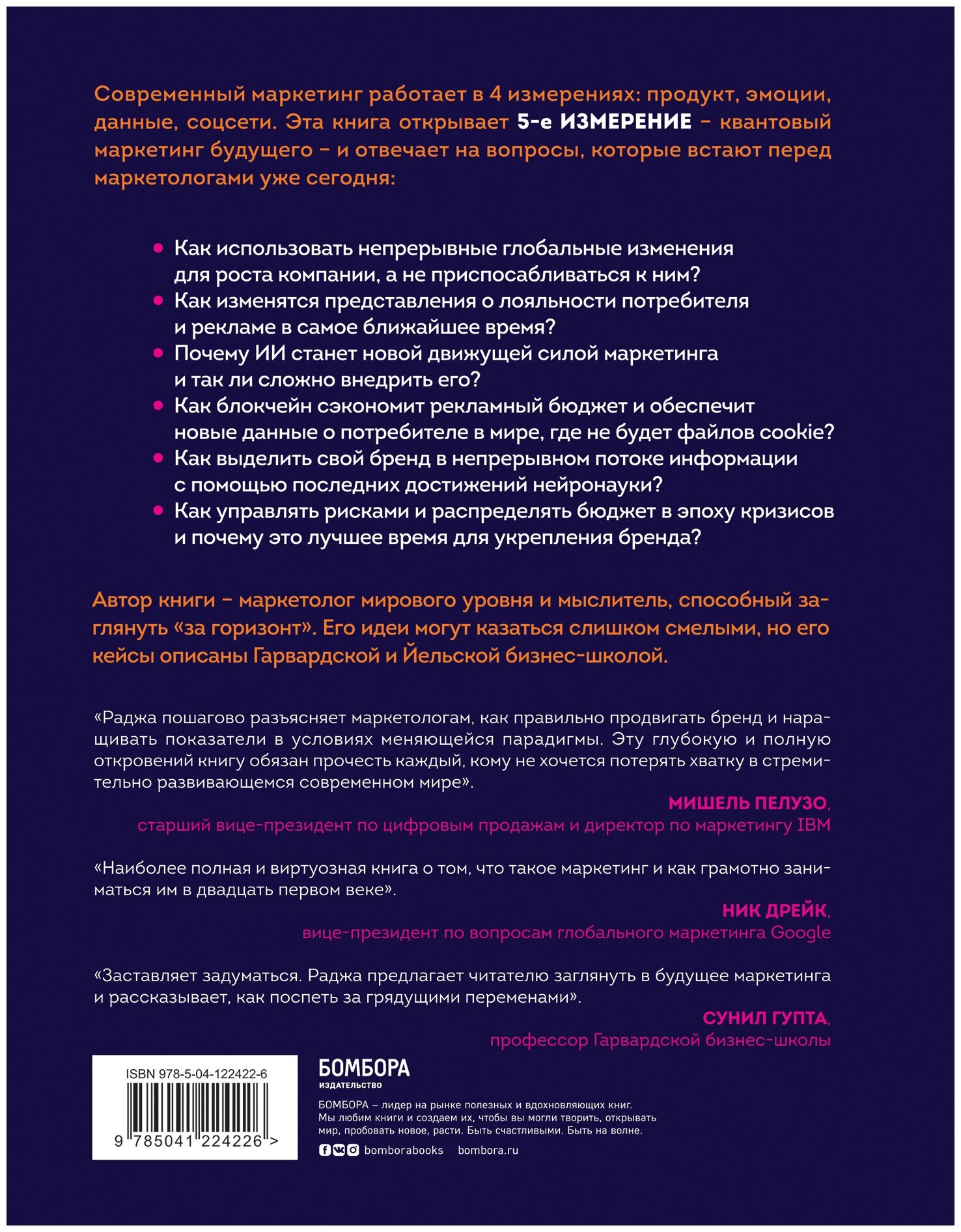 Современный маркетинг работает в 4-х измерениях: продукт, эмоции, данные, соцсети. Эта книга открывает 5-е измерение - квантовый маркетинг будущего - и отвечает на вопросы, которые встают перед маркетологами уже сегодня: