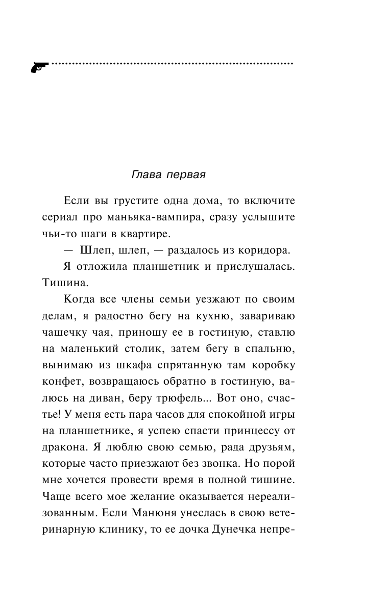 Даже у самого отважного храбреца есть свой страх. Даше Васильевой позвонила ее одноклассница Галя Бокова и попросила срочно приехать. Она явно была в панике. Галина рассказала, что пошла в гардеробный домик своей усадьбы, чтобы собрать ненужные вещи для неимущих. И там на полу обнаружила труп Эдуарда, племянника ее мужа Никиты. Пока подруги обсуждали случившееся, появился Эдик — живой и невредимый. А вскоре Галя снова позвала Дарью к себе в поместье, чтобы показать… тело Эдика, которого она нашла мертвым уже в собственной спальне. Но когда они вошли в комнату, там никого не было, а все стены были забрызганы кровью. Дамы в ужасе убежали. Даша позвала на подмогу эксперта Леню. И что вы думаете? Правильно, в покоях не оказалось ни следа крови! Ну это уже слишком! Васильева никому не позволит водить себя за нос и непременно разберется что происходит в заколдованном особняке Боковых.
