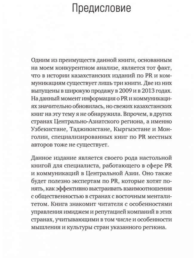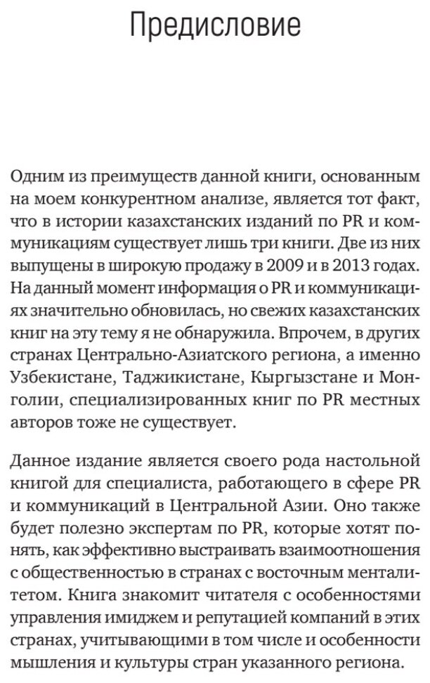 Для того, чтобы пиарщик мог грамотно выполнять свою работу, то есть влиять на аудиторию, ему необходимо хорошо знать эту аудиторию, ее желания и ее менталитет. Автор в своей книге сузил далеко не узкую область, в одной книге рассказал об особенностях рынка и менталитета Центральной Азии: Казахстан, Кыргызстан, Узбекистан, Таджикистан и Монголию. Цель книги - передать знания специалисту pr и коммуникаций, работающему или стремившемуся работать в Центральной Азии реальную ситуацию на рынке, и позволить работать "по книге". Автор рассказывает об отношениях pr с населением и со СМИ на территории. Кроме того, объективно рассказывает о работе pr, раскрывая как и позитивные моменты работы, так и сложности, которых не мало. И все же я бы посоветовала эту книгу узкому спектру - тем, кто хочет работать на указанной территории. Чтобы просто почитать про pr и отсеять мифы, а так же узнать о взаимоотношениях с другими отраслями, следует выбирать либо какую-то общую ситуацию, либо ситуацию на конкретной территории, на которой собираетесь работать.