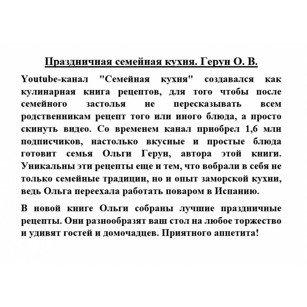 Со временем канал приобрел 1,6 млн подписчиков, настолько вкусные и простые блюда готовит семья Ольги Герун, автора этой книги. Уникальны эти рецепты еще и тем, что вобрали в себя не только семейные традиции, но и опыт заморской кухни, ведь Ольга переехала работать поваром в Испанию.