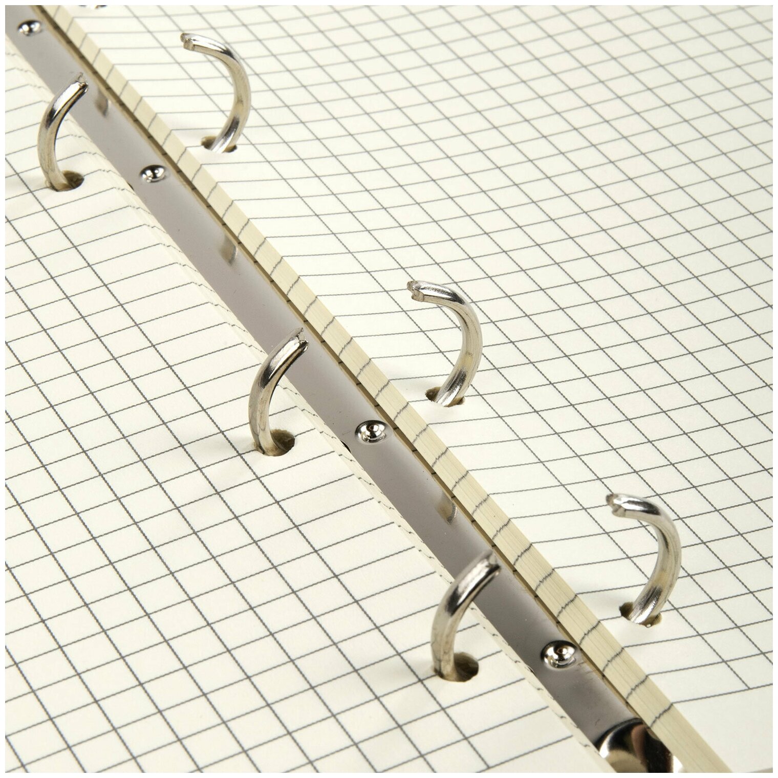 Блок состоит из 80 листов офсетной бумаги белого цвета плотностью 70 г/м2. Кольцевой механизм с 4-мя кольцами позволяет пользоваться сменным блоком в 120 листов. Линовка - клетка без полей. Мягкая интегральная обложка с тиснением фольгой и вырубкой под кольца выполнена из износоустойчивого материала с текстурой под гладкую кожу. Формат А5 удобно носить в рюкзаке/сумке, что позволит брать на учебу/работу всего одну тетрадь с возможностью добавлять и менять листы.