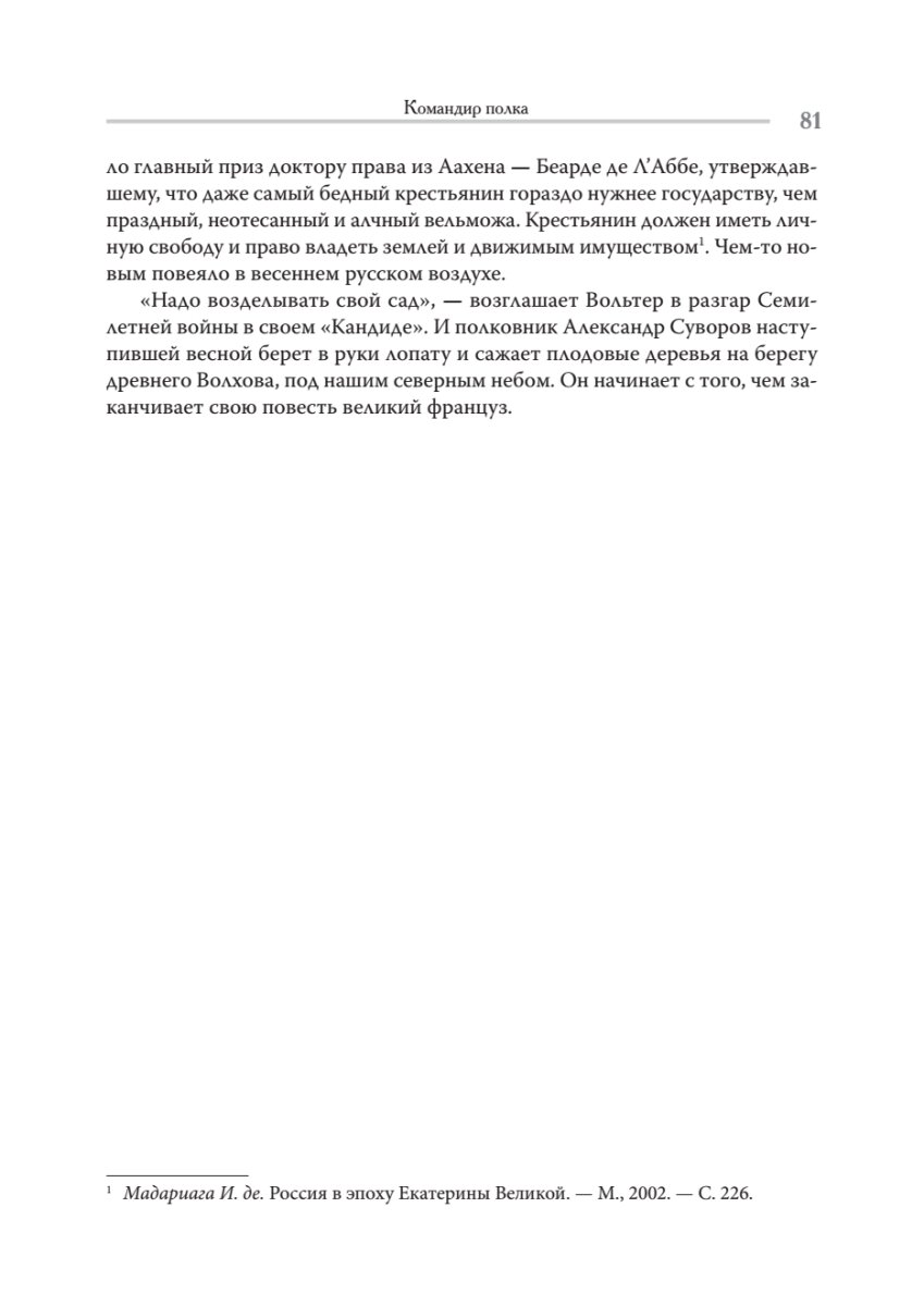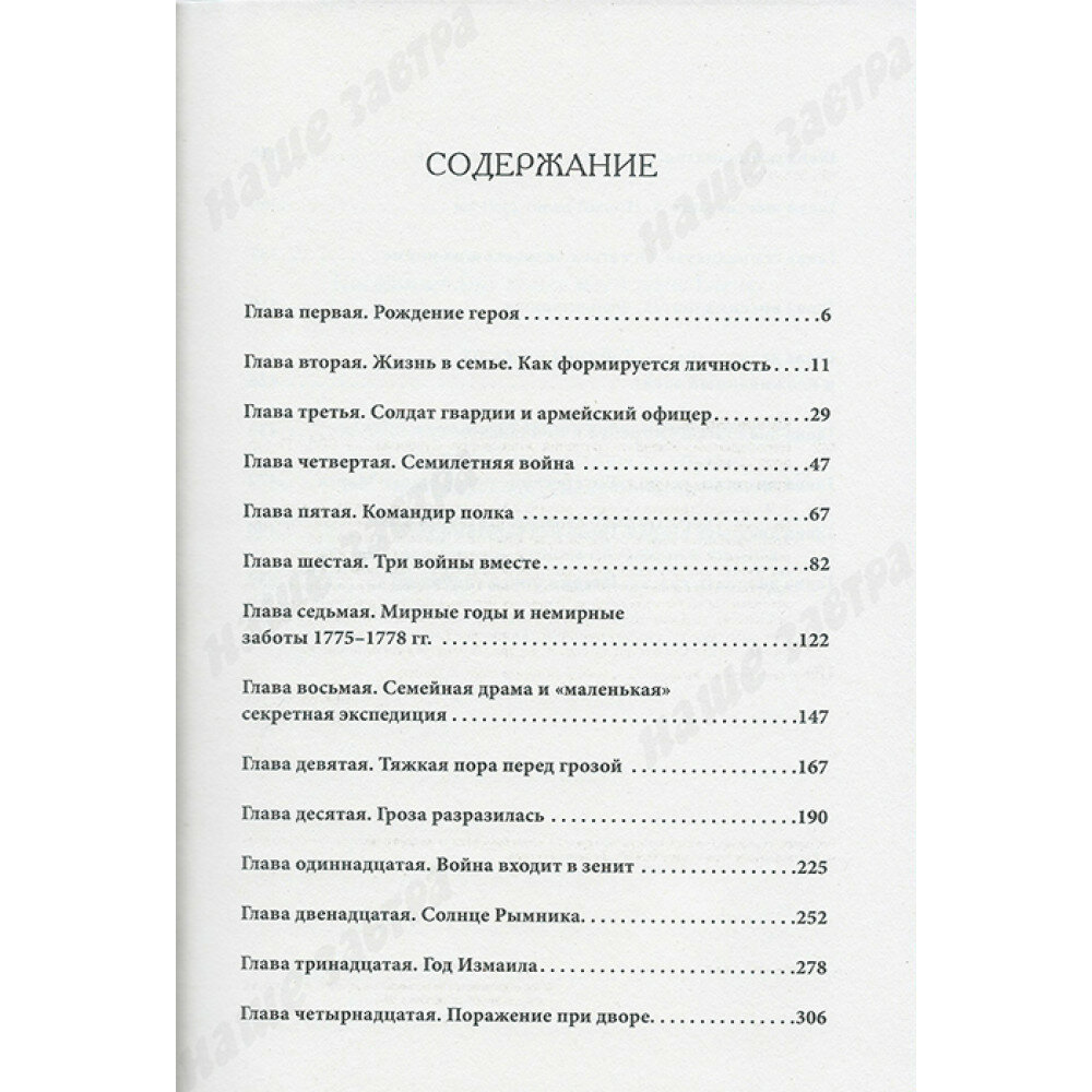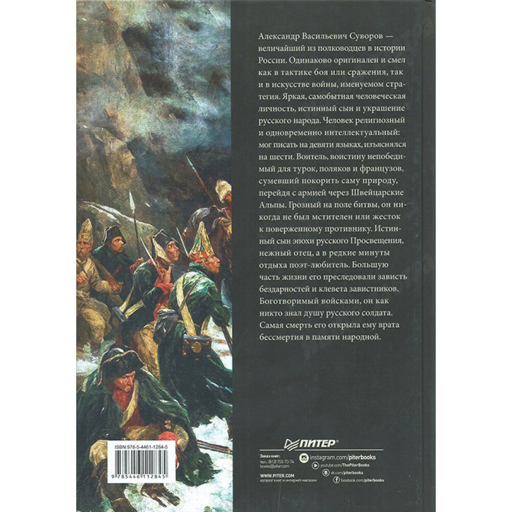 Александр Васильевич Суворов — величайший из полководцев в истории России. Одинаково оригинален и смел как в тактике боя или сражения, так и в искусстве войны, именуемом стратегия. Яркая, самобытная человеческая личность, истинный сын и украшение русского народа. Человек религиозный и одновременно интеллектуальный: мог писать на девяти языках, изъяснялся на шести. Воитель, воистину непобедимый для турок, поляков и французов, сумевший покорить саму природу, перейдя с армией через Швейцарские Альпы. Грозный на поле битвы, он никогда не был мстителен или жесток к поверженному противнику. Истинный сын эпохи русского Просвещения, нежный отец, а в редкие минуты отдыха поэт-любитель. Большую часть жизни его преследовали зависть бездарностей и клевета завистников. Боготворимый войсками, он как никто знал душу русского солдата. Самая смерть его открыла ему врата бессмертия в памяти народной.