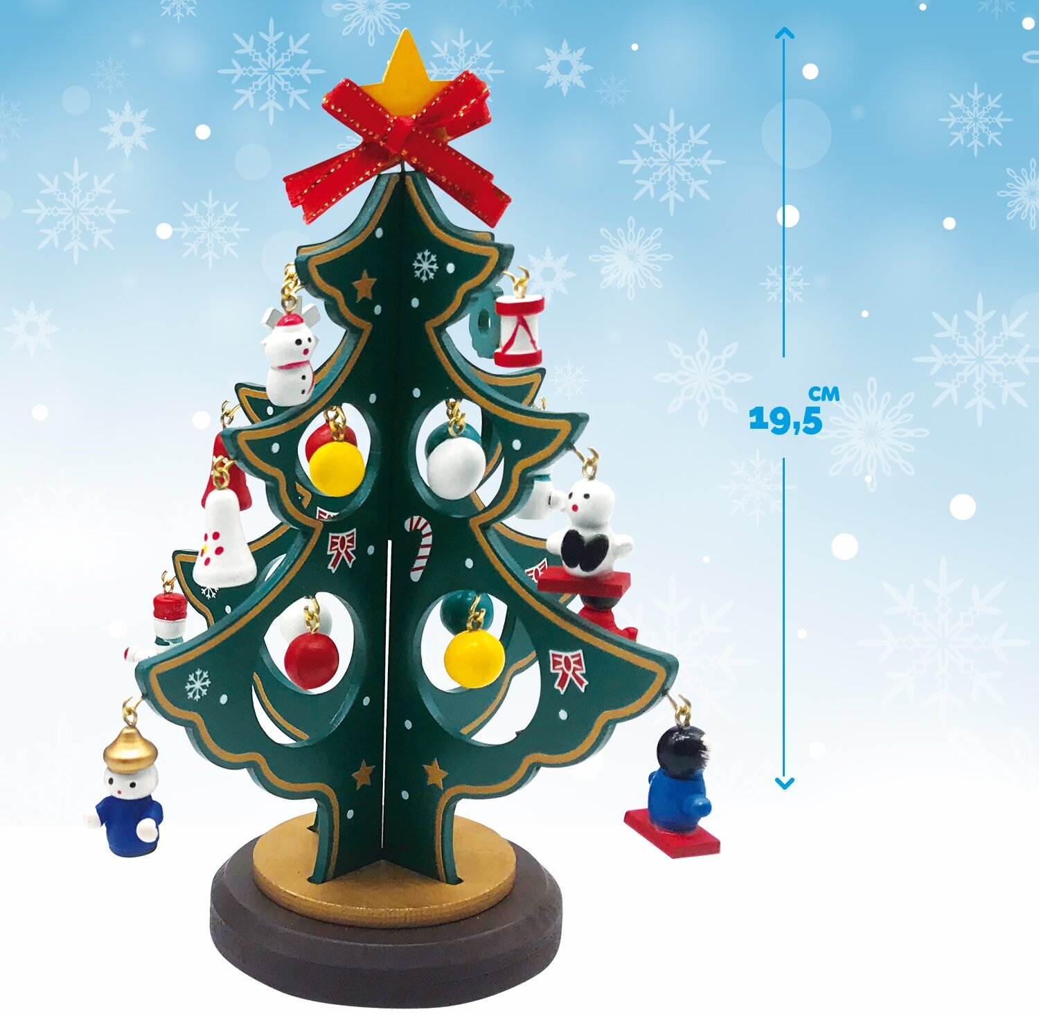 В набор входит удобная подставка, елка и игрушки. Высота дерева – 19,5 см.