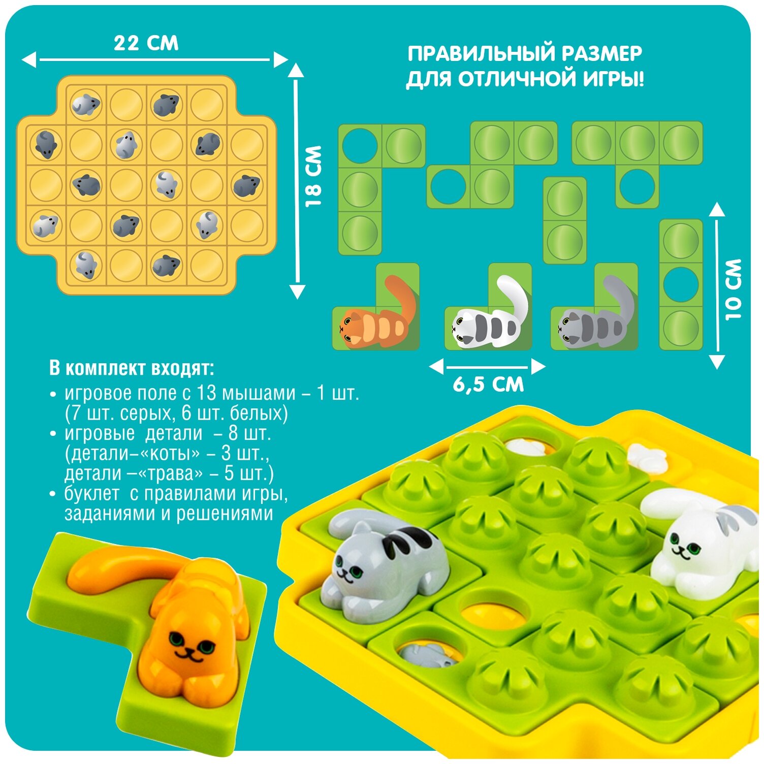 В комплекте есть все, что нужно для хорошей охоты - игровое поле с 13 мышами, коты - 3 шт., трава - 5 шт., буклет с заданиями и решениями.